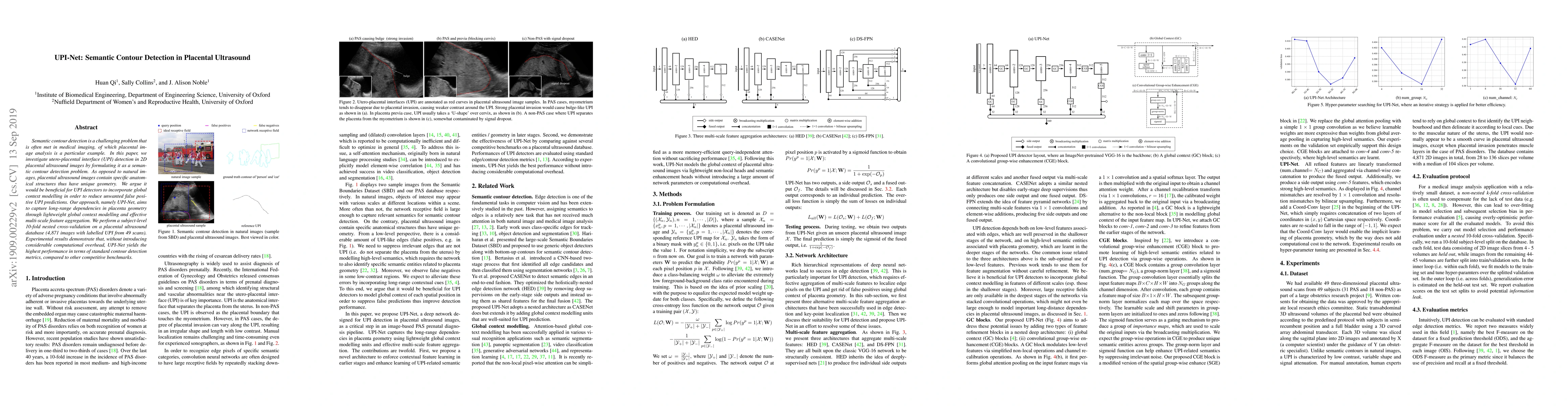 UPI-Net is a novel approach for detecting the utero-placental interface (UPI) in placental ultrasound images by employing semantic contour detection and global context modelling. The method outperforms other benchmarks in contour detection, achieving high accuracy without significant computational overhead.