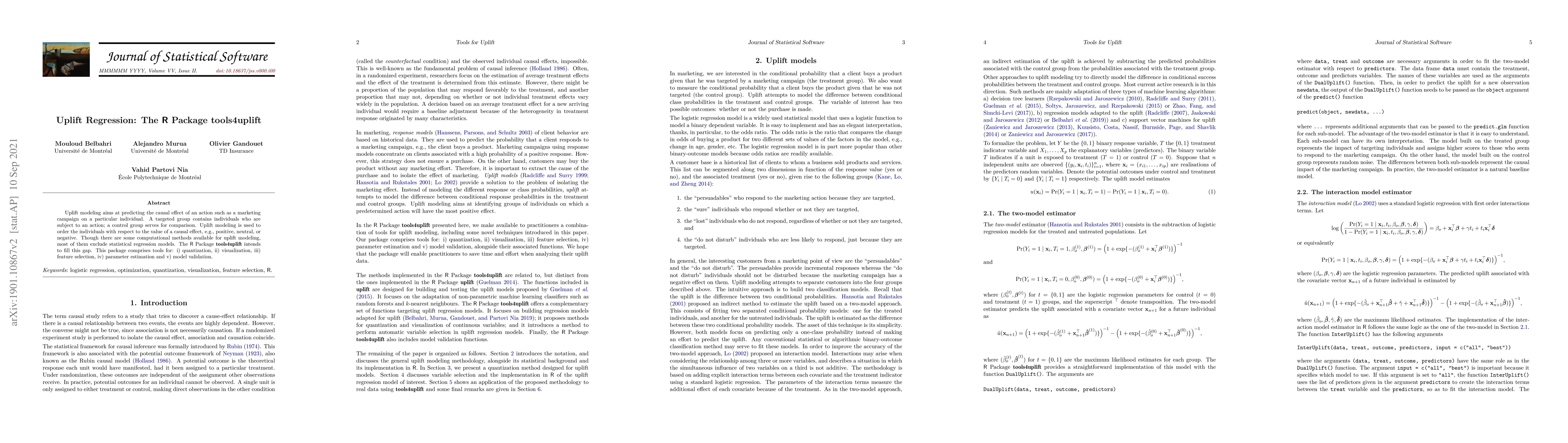 The R Package tools4uplift facilitates uplift modeling by providing statistical regression tools to predict the causal effect of actions like treatments or campaigns. It includes features for quantization, visualization, feature selection, parameter estimation, and model validation.
