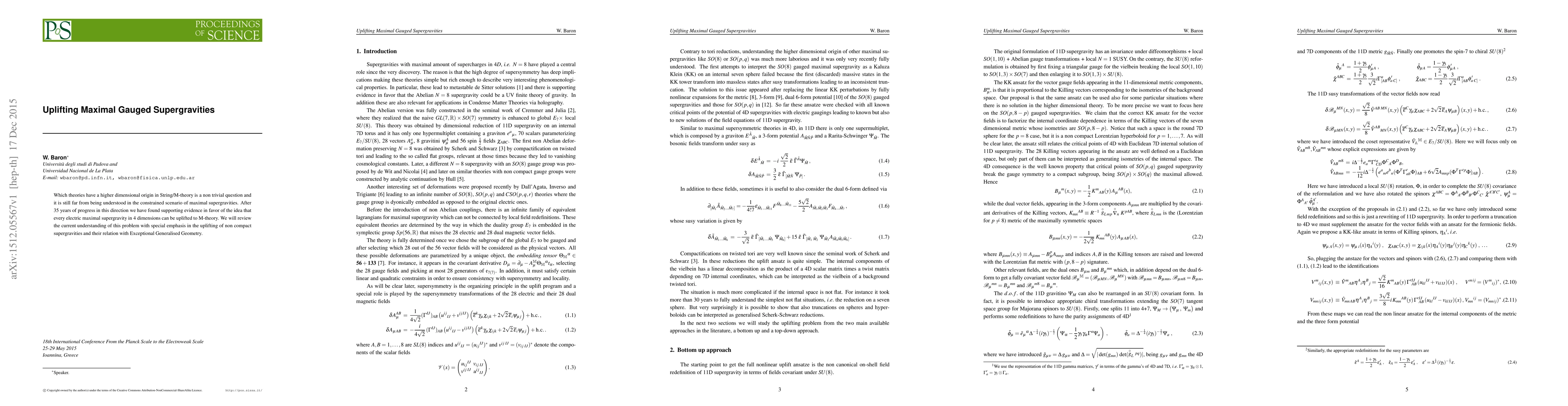 Which theories have a higher dimensional origin in String/M-theory is a non trivial question and it is still far from being understood in the constrained scenario of maximal supergravities. After 35 years of progress in this direction we have found supporting evidence in favor of the idea that every electric maximal supergravity in 4 dimensions can be uplifted to M-theory. We will review the current understanding of this problem with special emphasis in the uplifting of non compact supergravities and their relation with Exceptional Generalised Geometry.
