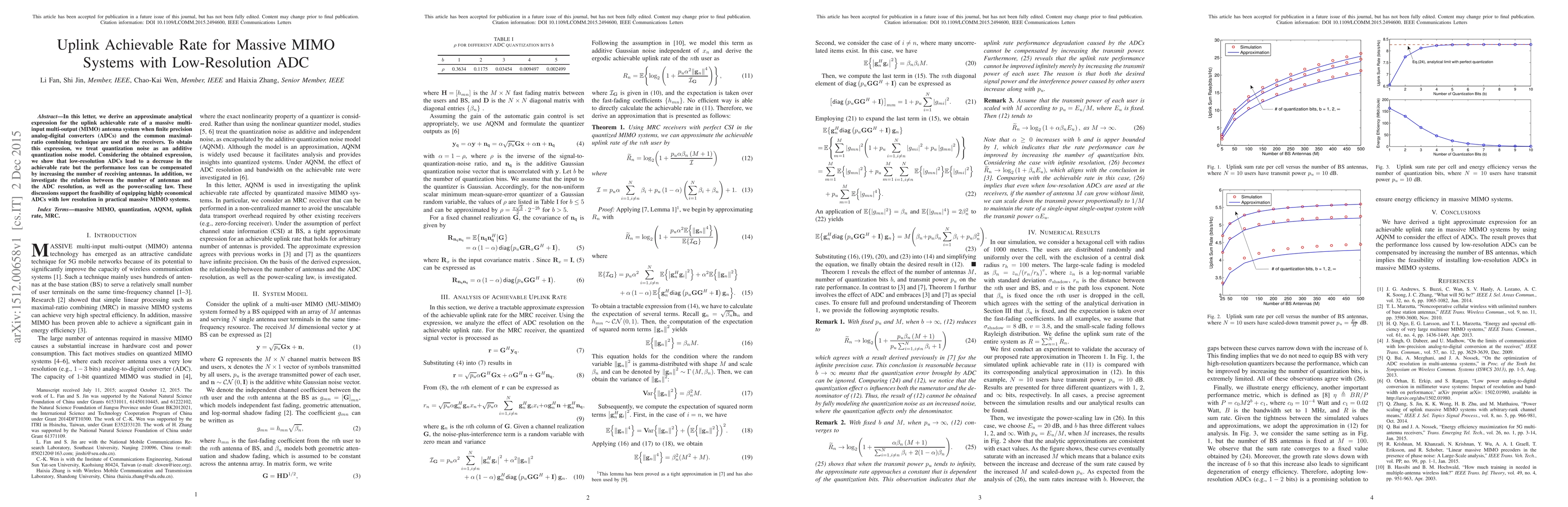 This paper derives an analytical expression for the uplink achievable rate in massive MIMO systems with low-resolution ADCs, showing that while lower ADC resolution reduces rate, the performance loss can be mitigated by increasing the number of receiving antennas. The study also explores the relationship between antenna count and ADC resolution, supporting the use of economical, low-resolution ADCs in practical applications.