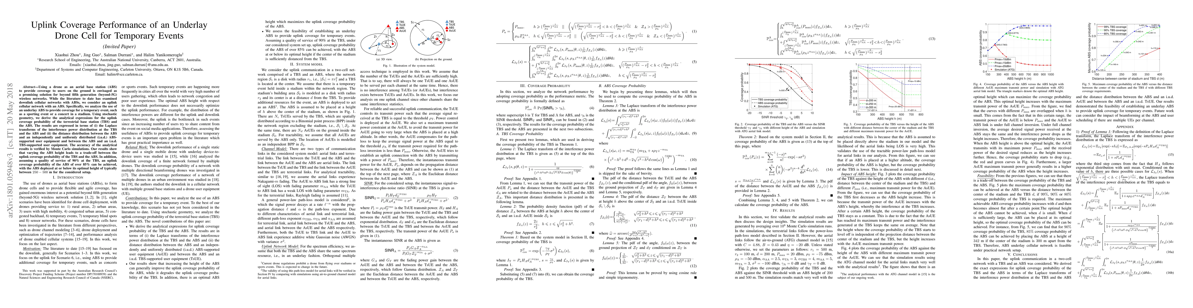 This paper investigates the uplink coverage performance of an underlay drone aerial base station (ABS) for temporary events, deriving analytical expressions for coverage probability using stochastic geometry. Results show that ABS height affects the trade-off between coverage probabilities of the terrestrial base station and the ABS, achieving over 85% uplink coverage for the ABS at optimal heights of 250-500 m.