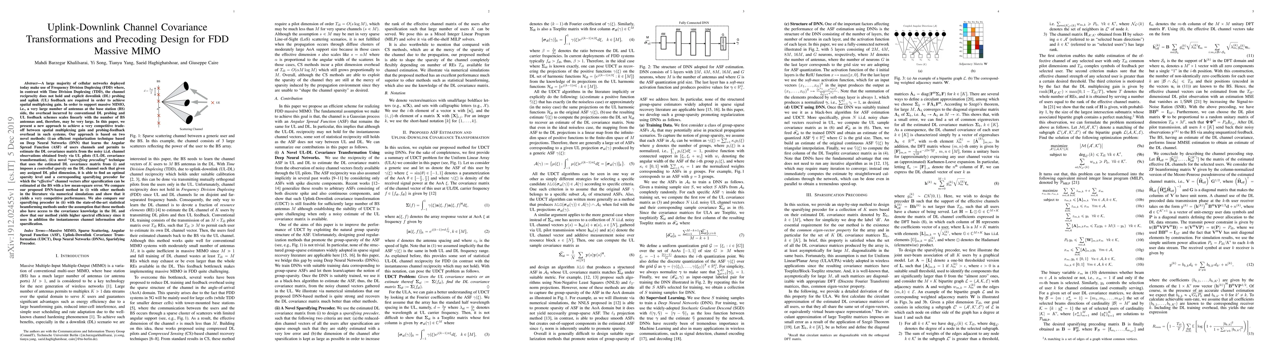 A large majority of cellular networks deployed today make use of Frequency Division Duplexing (FDD) where, in contrast with Time Division Duplexing (TDD), the channel reciprocity does not hold and explicit downlink (DL) probing and uplink (UL) feedback are needed in order to achieve spatial multiplexing gain. To support massive MIMO, the overhead incurred by conventional DL probing and UL feedback schemes scales linearly with the number of BS antennas and, therefore, may be very large. In this paper, we present a new approach to achieve a very competitive trade-off between spatial multiplexing gain and probing-feedback overhead in such systems. Our approach is based on two novel methods: (i) an efficient regularization technique based on Deep Neural Networks (DNN) that learns the Angular Spread Function (ASF) of users channels and permits to estimate the DL covariance matrix from the noisy i.i.d. channel observations obtained freely via UL pilots (UL-DL covariance transformation), (ii) a novel "sparsifying precoding" technique that uses the estimated DL covariance matrix from (i) and imposes a controlled sparsity on the DL channel such that given any assigned DL pilot dimension, it is able to find an optimal sparsity level and a corresponding sparsifying precoder for which the "effective" channel vectors after sparsification can be estimated at the BS with a low mean-square error. We compare our proposed DNN-based method in (i) with other methods in the literature via numerical simulations and show that it yields a very competitive performance. We also compare our sparsifying precoder in (ii) with the state-of-the-art statistical beamforming methods under the assumption that those methods also have access to the covariance knowledge in the DL and show that our method yields higher spectral efficiency since it uses in addition the instantaneous channel information after sparsification.