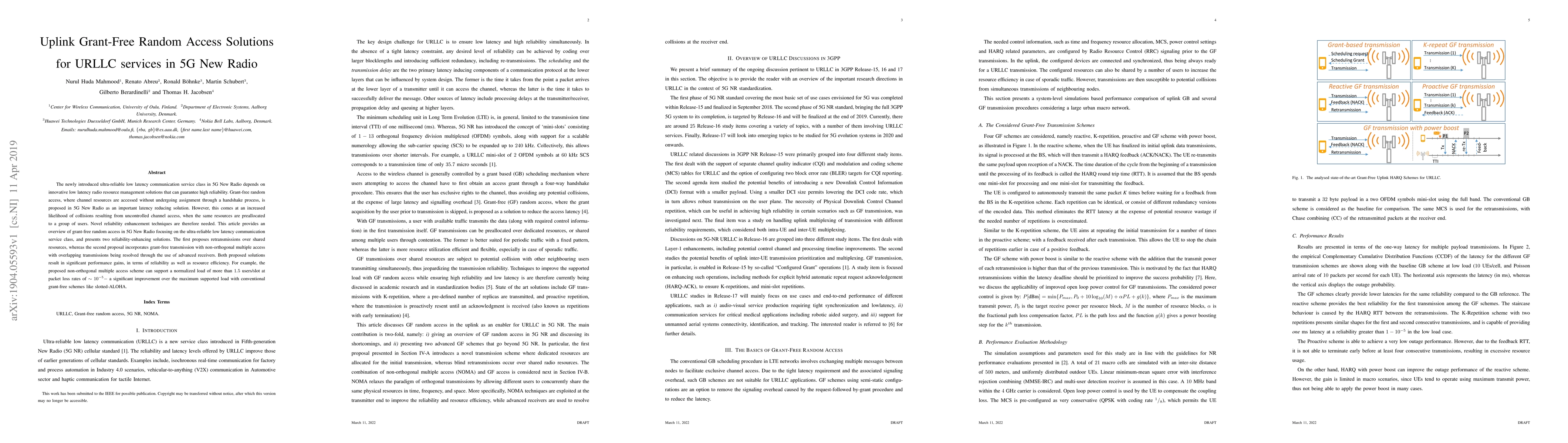 This paper explores grant-free random access solutions for ultra-reliable low latency communication (URLLC) in 5G New Radio, addressing the increased collision likelihood without assignment. It proposes two reliability enhancement techniques: retransmissions over shared resources and a non-orthogonal multiple access scheme with advanced receivers, achieving significant performance improvements in reliability and resource efficiency.