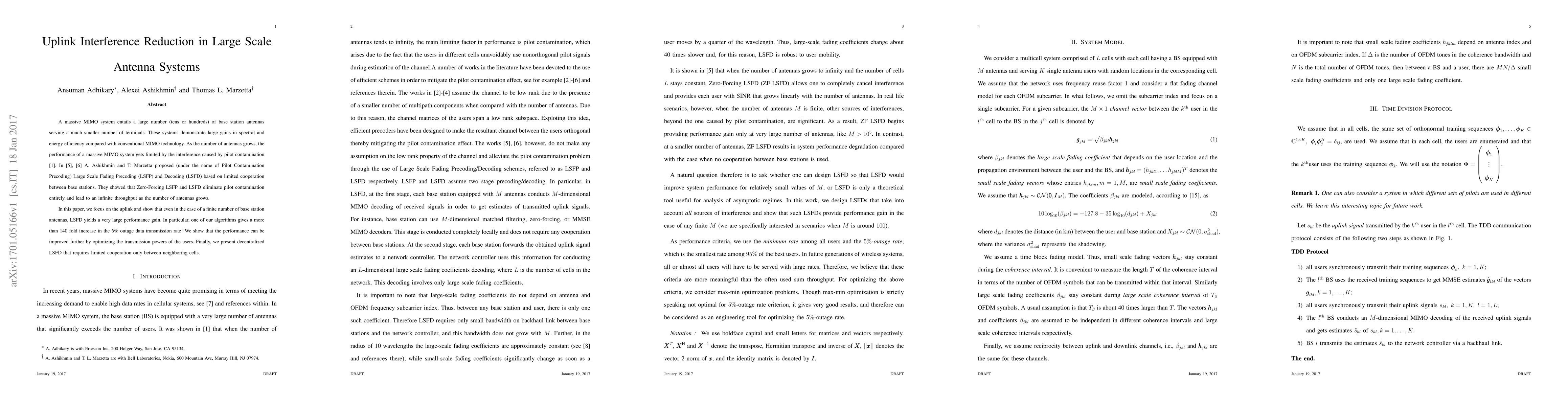 A massive MIMO system entails a large number (tens or hundreds) of base station antennas serving a much smaller number of terminals. These systems demonstrate large gains in spectral and energy efficiency compared with conventional MIMO technology. As the number of antennas grows, the performance of a massive MIMO system gets limited by the interference caused by pilot contamination. Earlier A. Ashikhmin and T. Marzetta proposed (under the name of Pilot Contamination Precoding) Large Scale Fading Precoding (LSFP) and Decoding (LSFD) based on limited cooperation between base stations. They showed that Zero-Forcing LSFP and LSFD eliminate pilot contamination entirely and lead to an infinite throughput as the number of antennas grows. In this paper, we focus on the uplink and show that even in the case of a finite number of base station antennas, LSFD yields a very large performance gain. In particular, one of our algorithms gives a more than 140 fold increase in the 5% outage data transmission rate! We show that the performance can be improved further by optimizing the transmission powers of the users. Finally, we present decentralized LSFD that requires limited cooperation only between neighboring cells.