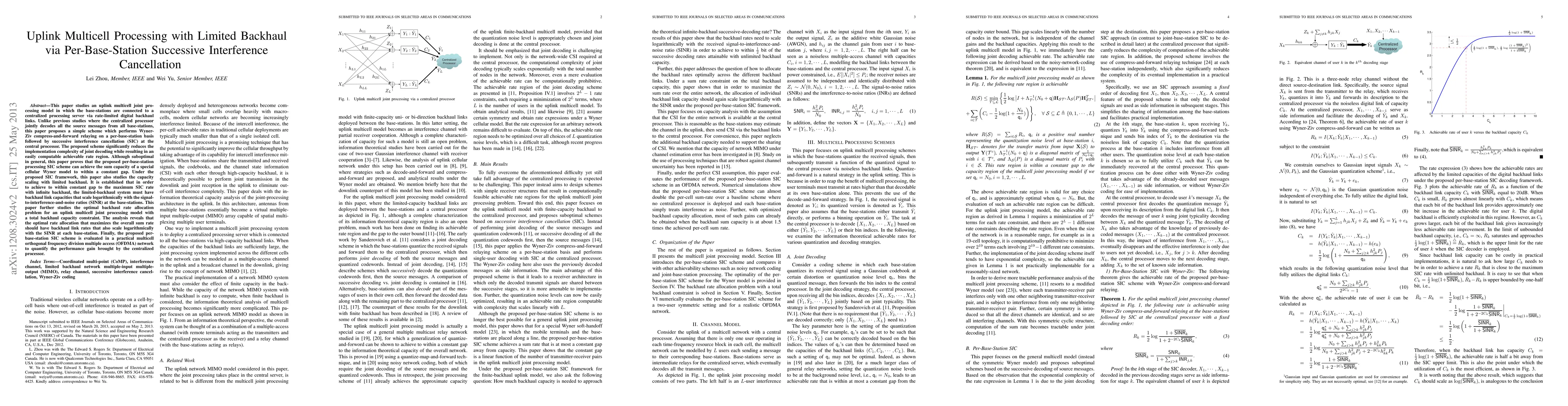 This paper studies an uplink multicell joint processing model in which the base-stations are connected to a centralized processing server via rate-limited digital backhaul links. Unlike previous studies where the centralized processor jointly decodes all the source messages from all base-stations, this paper proposes a suboptimal achievability scheme in which the Wyner-Ziv compress-and-forward relaying technique is employed on a per-base-station basis, but successive interference cancellation (SIC) is used at the central processor to mitigate multicell interference. This results in an achievable rate region that is easily computable, in contrast to the joint processing schemes in which the rate regions can only be characterized by exponential number of rate constraints. Under the per-base-station SIC framework, this paper further studies the impact of the limited-capacity backhaul links on the achievable rates and establishes that in order to achieve to within constant number of bits to the maximal SIC rate with infinite-capacity backhaul, the backhaul capacity must scale logarithmically with the signal-to-interference-and-noise ratio (SINR) at each base-station. Finally, this paper studies the optimal backhaul rate allocation problem for an uplink multicell joint processing model with a total backhaul capacity constraint. The analysis reveals that the optimal strategy that maximizes the overall sum rate should also scale with the log of the SINR at each base-station.