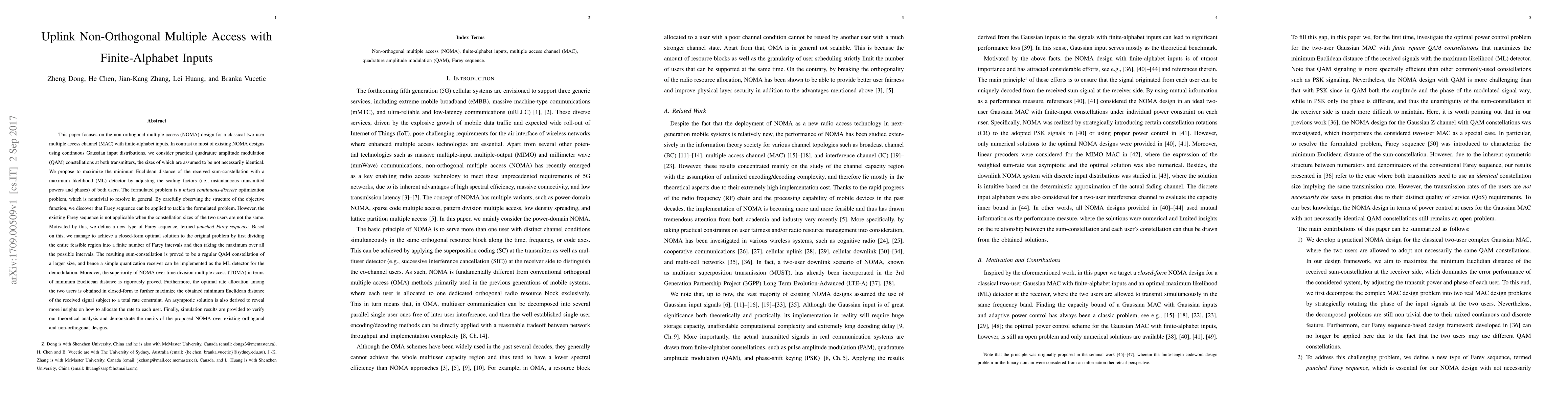 This paper focuses on the non-orthogonal multiple access (NOMA) design for a classical two-user multiple access channel (MAC) with finite-alphabet inputs. We consider practical quadrature amplitude modulation (QAM) constellations at both transmitters, the sizes of which are assumed to be not necessarily identical. We propose to maximize the minimum Euclidean distance of the received sum-constellation with a maximum likelihood (ML) detector by adjusting the scaling factors (i.e., instantaneous transmitted powers and phases) of both users. The formulated problem is a mixed continuous-discrete optimization problem, which is nontrivial to resolve in general. By carefully observing the structure of the objective function, we discover that Farey sequence can be applied to tackle the formulated problem. However, the existing Farey sequence is not applicable when the constellation sizes of the two users are not the same. Motivated by this, we define a new type of Farey sequence, termed punched Farey sequence. Based on this, we manage to achieve a closed-form optimal solution to the original problem by first dividing the entire feasible region into a finite number of Farey intervals and then taking the maximum over all the possible intervals. The resulting sum-constellation is proved to be a regular QAM constellation of a larger size. Moreover, the superiority of NOMA over time-division multiple access (TDMA) in terms of minimum Euclidean distance is rigorously proved. Furthermore, the optimal rate allocation among the two users is obtained in closed-form to further maximize the obtained minimum Euclidean distance of the received signal subject to a total rate constraint. Finally, simulation results are provided to verify our theoretical analysis and demonstrate the merits of the proposed NOMA over existing orthogonal and non-orthogonal designs.