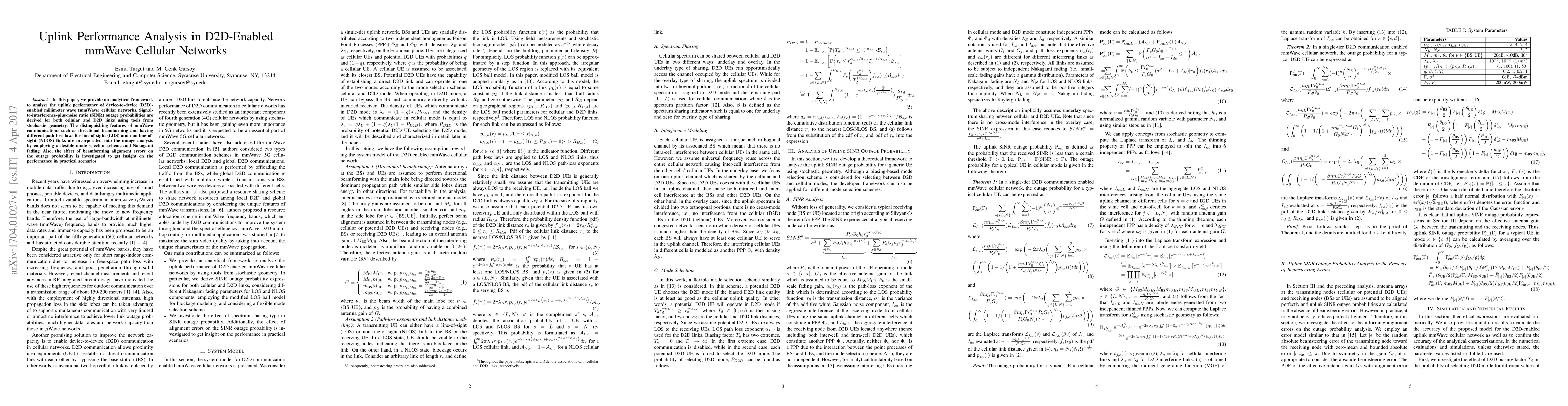 This paper develops an analytical framework to evaluate the uplink performance in D2D-enabled mmWave networks, deriving SINR outage probabilities for both cellular and D2D links. It incorporates mmWave features like directional beamforming and different path loss laws, and examines the impact of beamforming alignment errors on performance.