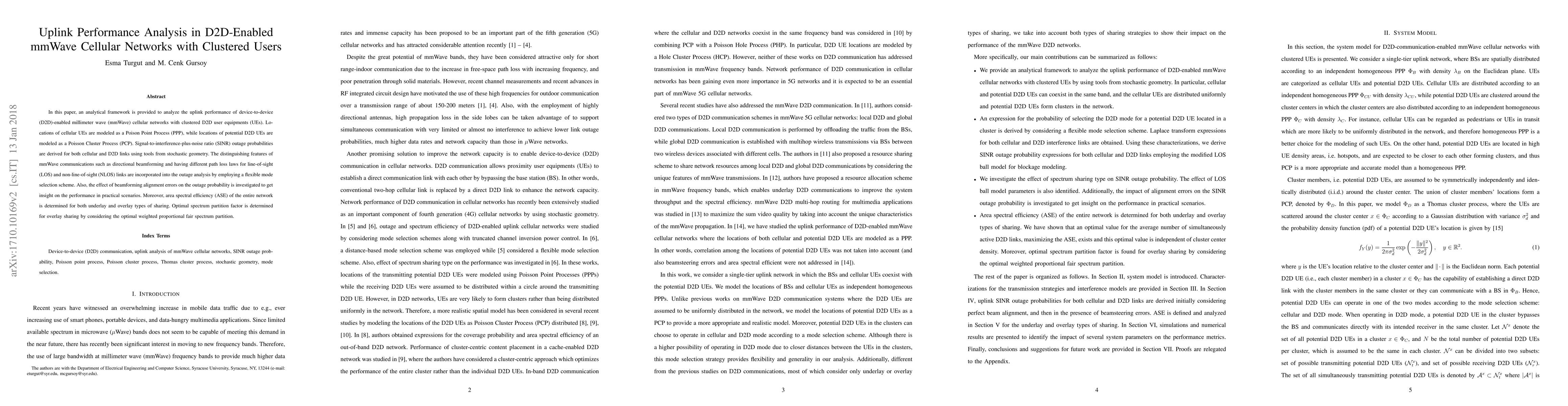 This paper analyzes the uplink performance of D2D-enabled mmWave networks with clustered users using stochastic geometry, deriving SINR outage probabilities for cellular and D2D links, and considering directional beamforming and beamforming errors. It also determines area spectral efficiency and optimal spectrum partition for overlay sharing.