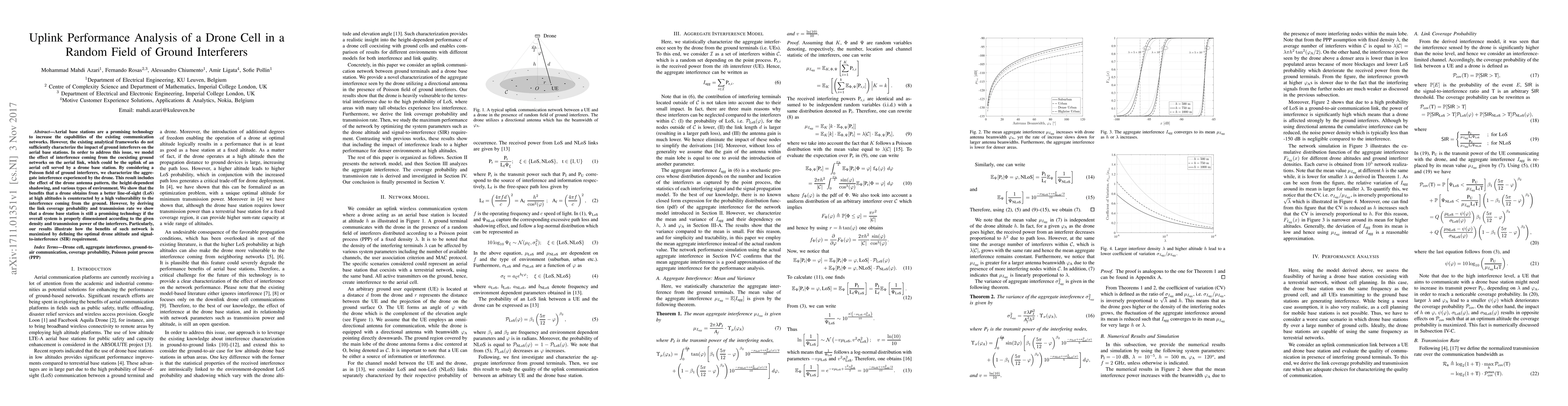 This paper models the uplink performance of a drone base station in the presence of ground interferers, showing that while drones benefit from better line-of-sight at high altitudes, they are also highly vulnerable to ground interference. The study derives optimal drone altitude and signal-to-interference requirements to maximize network performance.