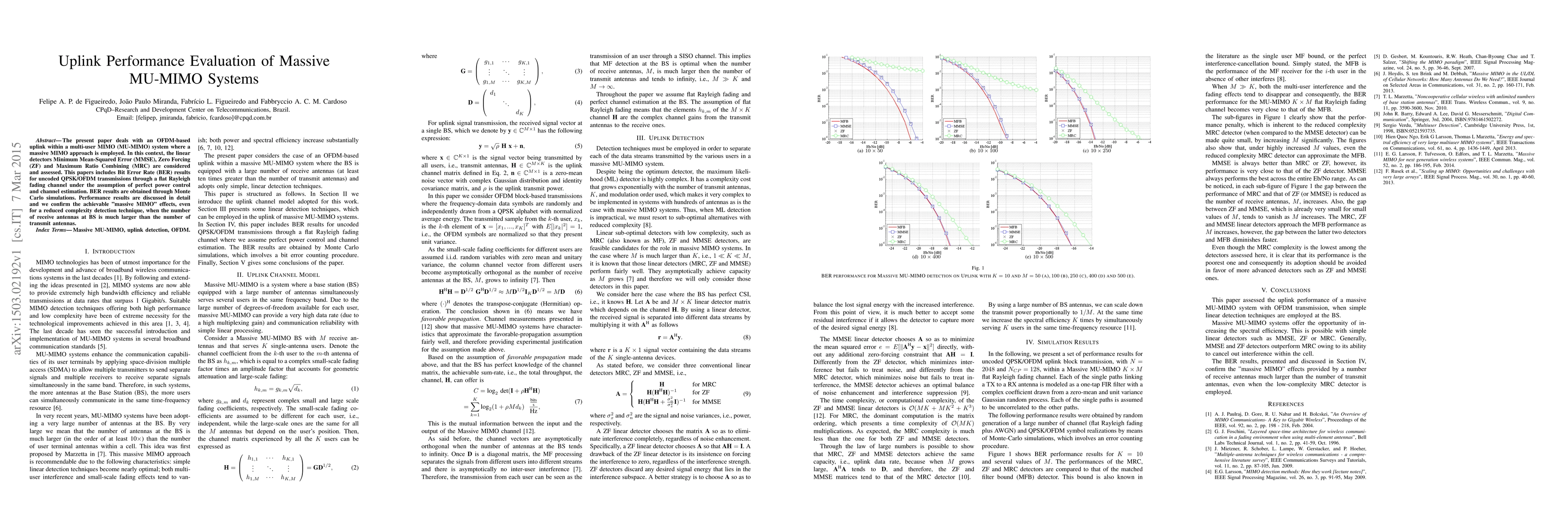 The present paper deals with an OFDM-based uplink within a multi-user MIMO (MU-MIMO) system where a massive MIMO approach is employed. In this context, the linear detectors Minimum Mean-Squared Error (MMSE), Zero Forcing (ZF) and Maximum Ratio Combining (MRC) are considered and assessed. This papers includes Bit Error Rate (BER) results for uncoded QPSK/OFDM transmissions through a flat Rayleigh fading channel under the assumption of perfect power control and channel estimation. BER results are obtained through Monte Carlo simulations. Performance results are discussed in detail and we confirm the achievable "massive MIMO" effects, even for a reduced complexity detection technique, when the number of receive antennas at BS is much larger than the number of transmit antennas.