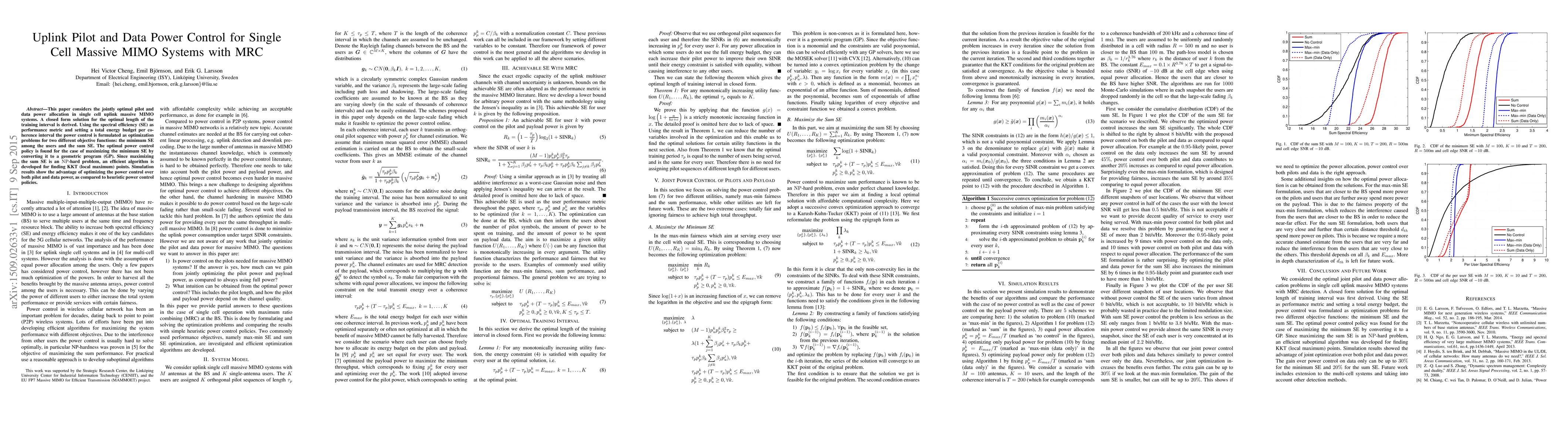 This paper optimizes pilot and data power allocation in single cell massive MIMO systems, deriving a closed-form solution for training interval length and formulating power control as optimization problems for minimum and sum spectral efficiency. An efficient algorithm is developed for NP-hard sum SE maximization, demonstrating improved performance over heuristic methods.