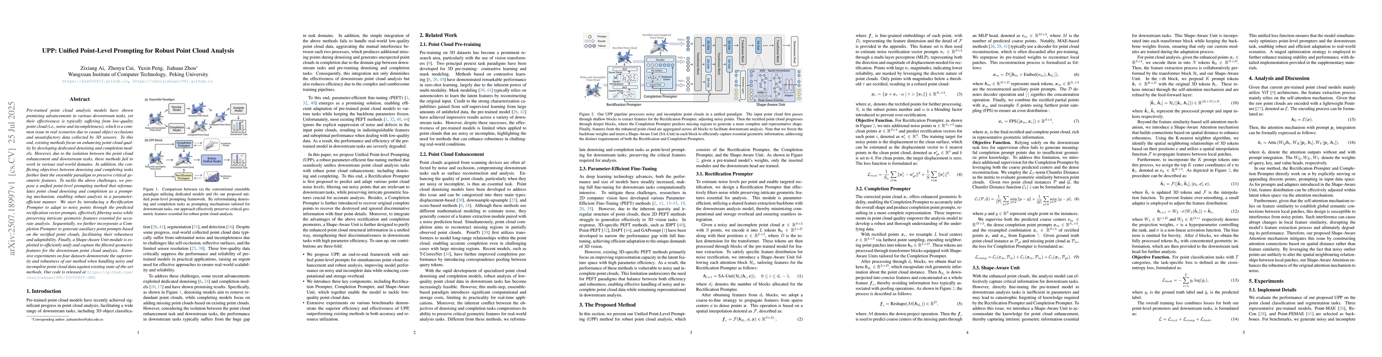 Pre-trained point cloud analysis models have shown promising advancements in various downstream tasks, yet their effectiveness is typically suffering from low-quality point cloud (i.e., noise and incompleteness), which is a common issue in real scenarios due to casual object occlusions and unsatisfactory data collected by 3D sensors. To this end, existing methods focus on enhancing point cloud quality by developing dedicated denoising and completion models. However, due to the isolation between the point cloud enhancement and downstream tasks, these methods fail to work in various real-world domains. In addition, the conflicting objectives between denoising and completing tasks further limit the ensemble paradigm to preserve critical geometric features. To tackle the above challenges, we propose a unified point-level prompting method that reformulates point cloud denoising and completion as a prompting mechanism, enabling robust analysis in a parameter-efficient manner. We start by introducing a Rectification Prompter to adapt to noisy points through the predicted rectification vector prompts, effectively filtering noise while preserving intricate geometric features essential for accurate analysis. Sequentially, we further incorporate a Completion Prompter to generate auxiliary point prompts based on the rectified point clouds, facilitating their robustness and adaptability. Finally, a Shape-Aware Unit module is exploited to efficiently unify and capture the filtered geometric features for the downstream point cloud analysis.Extensive experiments on four datasets demonstrate the superiority and robustness of our method when handling noisy and incomplete point cloud data against existing state-of-the-art methods. Our code is released at https://github.com/zhoujiahuan1991/ICCV2025-UPP.