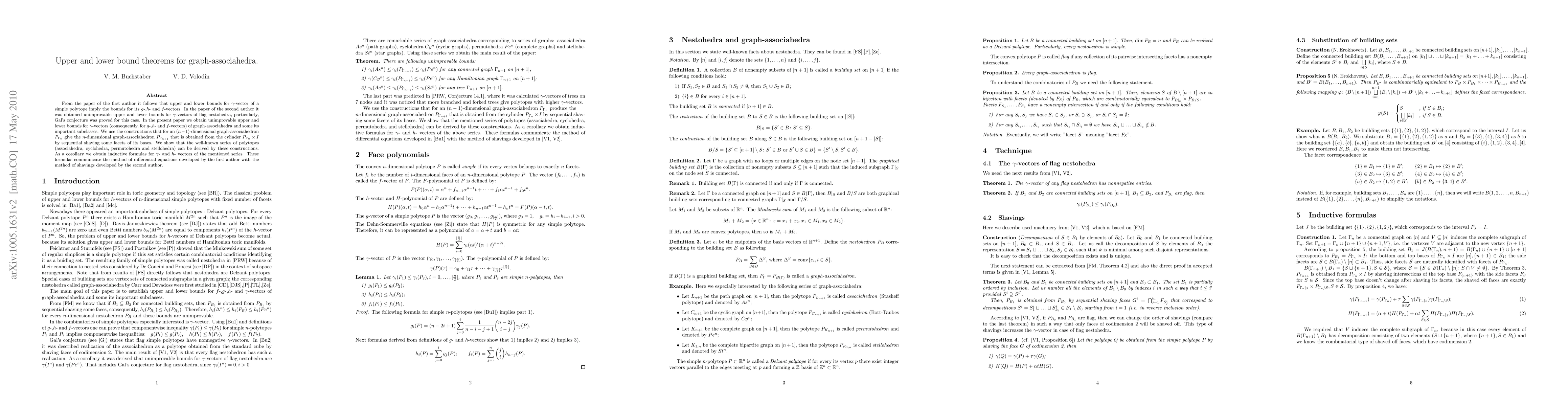 From the paper of the first author it follows that upper and lower bounds for $\gamma$-vector of a simple polytope imply the bounds for its $g$-,$h$- and $f$-vectors. In the paper of the second author it was obtained unimprovable upper and lower bounds for $\gamma$-vectors of flag nestohedra, particularly Gal's conjecture was proved for this case. In the present paper we obtain unimprovable upper and lower bounds for $\gamma$-vectors (consequently, for $g$-,$h$- and $f$-vectors) of graph-associahedra and some its important subclasses. We use the constructions that for an $(n-1)$-dimensional graph-associahedron $P_{\Gamma_n}$ give the $n$-dimensional graph-associahedron $P_{\Gamma_{n+1}}$ that is obtained from the cylinder $P_{\Gamma_n}\times I$ by sequential shaving some facets of its bases. We show that the well-known series of polytopes (associahedra, cyclohedra, permutohedra and stellohedra) can be derived by these constructions. As a corollary we obtain inductive formulas for $\gamma$- and $h$- vectors of the mentioned series. These formulas communicate the method of differential equations developed by the first author with the method of shavings developed by the second author.