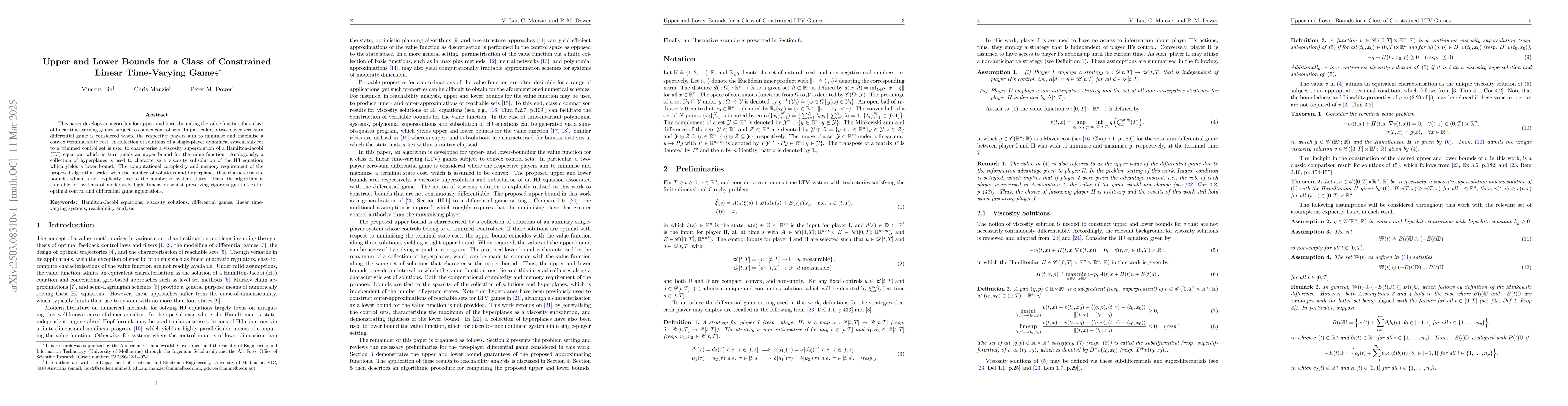 This research develops an algorithm for upper- and lower-bounding the value function for a class of linear time-varying games subject to convex control sets, using collections of solutions of a single-player dynamical system and hyperplanes to characterize viscosity supersolutions and subsolutions of a Hamilton-Jacobi equation.