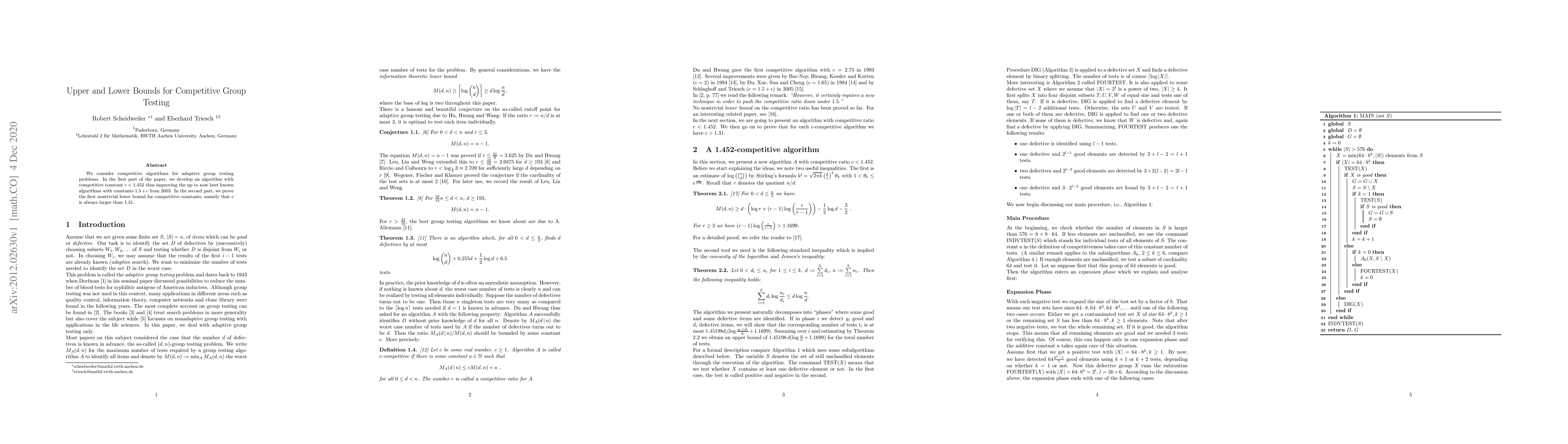 Researchers have developed an algorithm with a competitive constant c < 1.452 for adaptive group testing problems, improving previous best-known algorithms. They also established the first nontrivial lower bound for competitive constants, showing that c must be greater than 1.31.