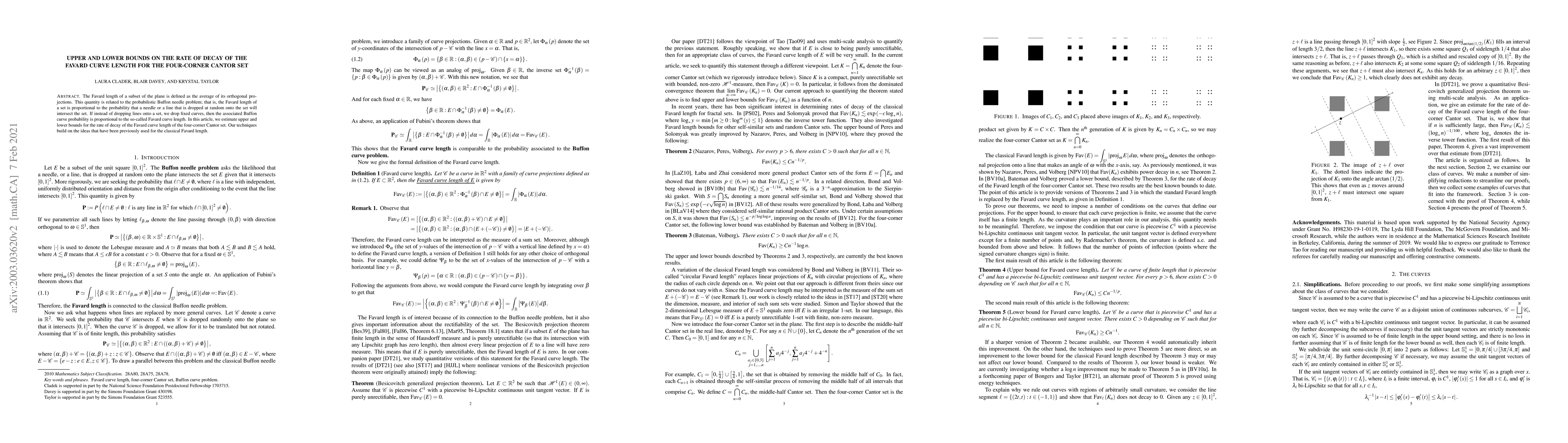 Researchers estimate upper and lower bounds for how fast the length of Favard curves on the four-corner Cantor set decays, finding that it equals zero due to the set's unrectifiable nature.
