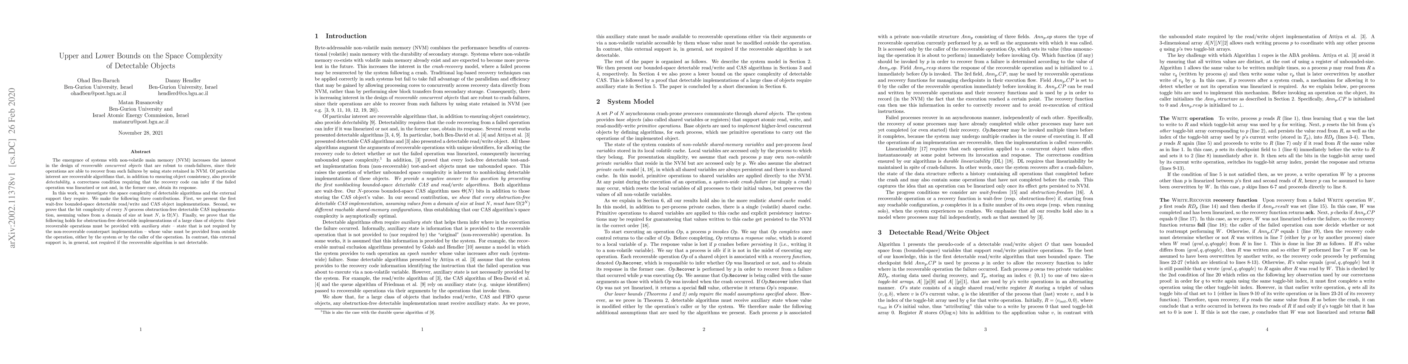The emergence of systems with non-volatile main memory (NVM) increases the interest in the design of \emph{recoverable concurrent objects} that are robust to crash-failures, since their operations are able to recover from such failures by using state retained in NVM. Of particular interest are recoverable algorithms that, in addition to ensuring object consistency, also provide \emph{detectability}, a correctness condition requiring that the recovery code can infer if the failed operation was linearized or not and, in the former case, obtain its response. In this work, we investigate the space complexity of detectable algorithms and the external support they require. We make the following three contributions. First, we present the first wait-free bounded-space detectable read/write and CAS object implementations. Second, we prove that the bit complexity of every $N$-process obstruction-free detectable CAS implementation, assuming values from a domain of size at least $N$, is $\Omega(N)$. Finally, we prove that the following holds for obstruction-free detectable implementations of a large class of objects: their recoverable operations must be provided with \emph{auxiliary state} -- state that is not required by the non-recoverable counterpart implementation -- whose value must be provided from outside the operation, either by the system or by the caller of the operation. In contrast, this external support is, in general, not required if the recoverable algorithm is not detectable.