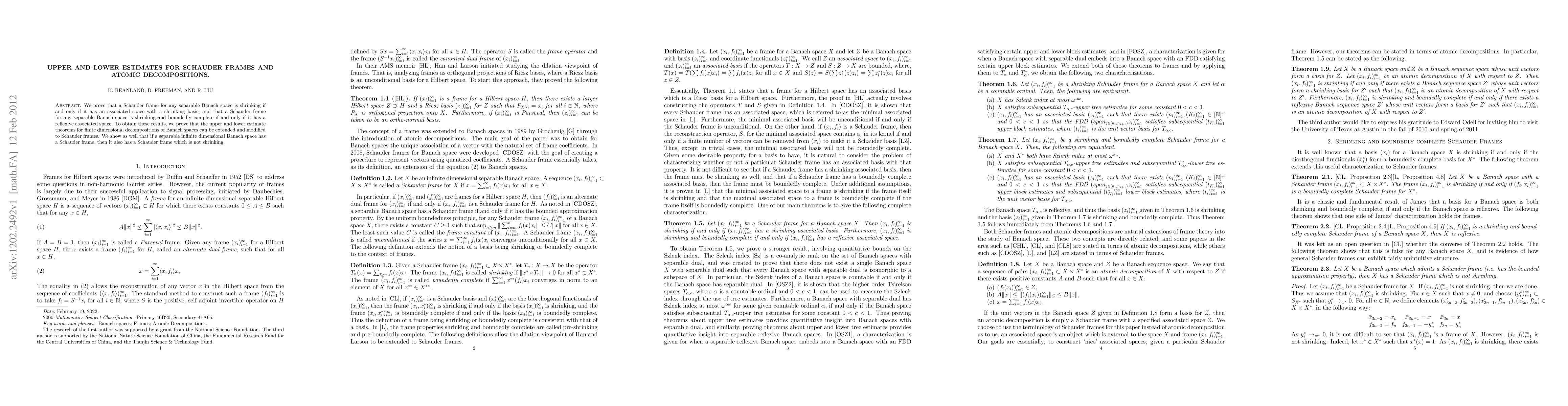 We prove that a Schauder frame for any separable Banach space is shrinking if and only if it has an associated space with a shrinking basis, and that a Schauder frame for any separable Banach space is shrinking and boundedly complete if and only if it has a reflexive associated space. To obtain these results, we prove that the upper and lower estimate theorems for finite dimensional decompositions of Banach spaces can be extended and modified to Schauder frames. We show as well that if a separable infinite dimensional Banach space has a Schauder frame, then it also has a Schauder frame which is not shrinking.