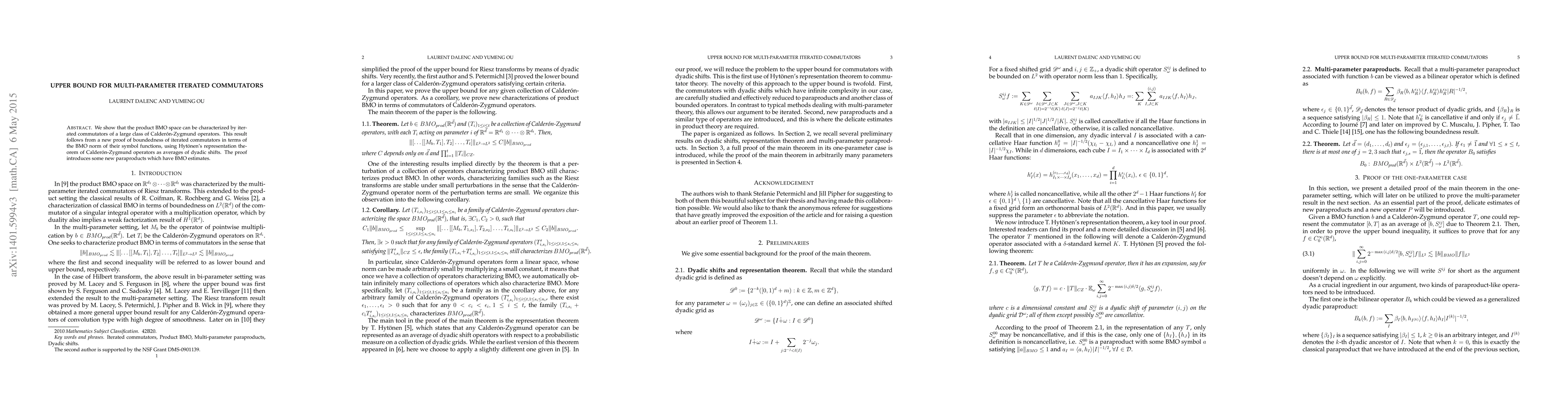 We show that the product BMO space can be characterized by iterated commutators of a large class of Calder\'on-Zygmund operators. This result follows from a new proof of boundedness of iterated commutators in terms of the BMO norm of their symbol functions, using Hyt\"onen's representation theorem of Calder\'on-Zygmund operators as averages of dyadic shifts. The proof introduces some new paraproducts which have BMO estimates.
