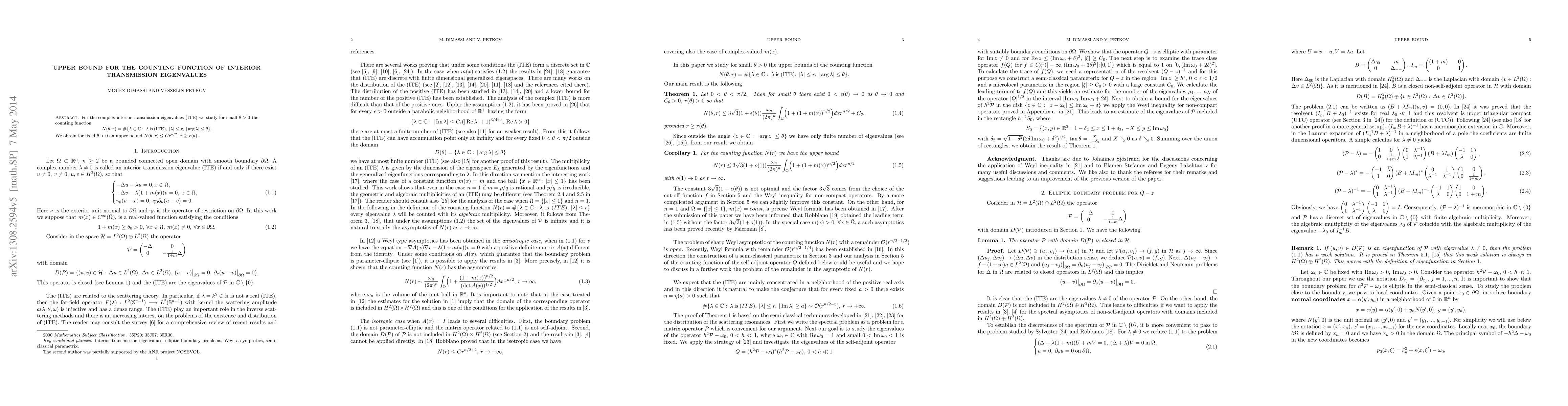 For the complex interior transmission eigenvalues (ITE) we study for small $\theta > 0$ the counting function $$N(\theta, r) = #\{\lambda \in \C:\: \lambda \: {\rm is} \: {\rm (ITE)},\: |\lambda| \leq r, \: 0 \leq \arg \lambda \leq \theta\}.$$ We obtain for fixed $\theta > 0$ an upper bound $N(\theta, r) \leq C r^{n/2}, \: r \geq r(\theta).$