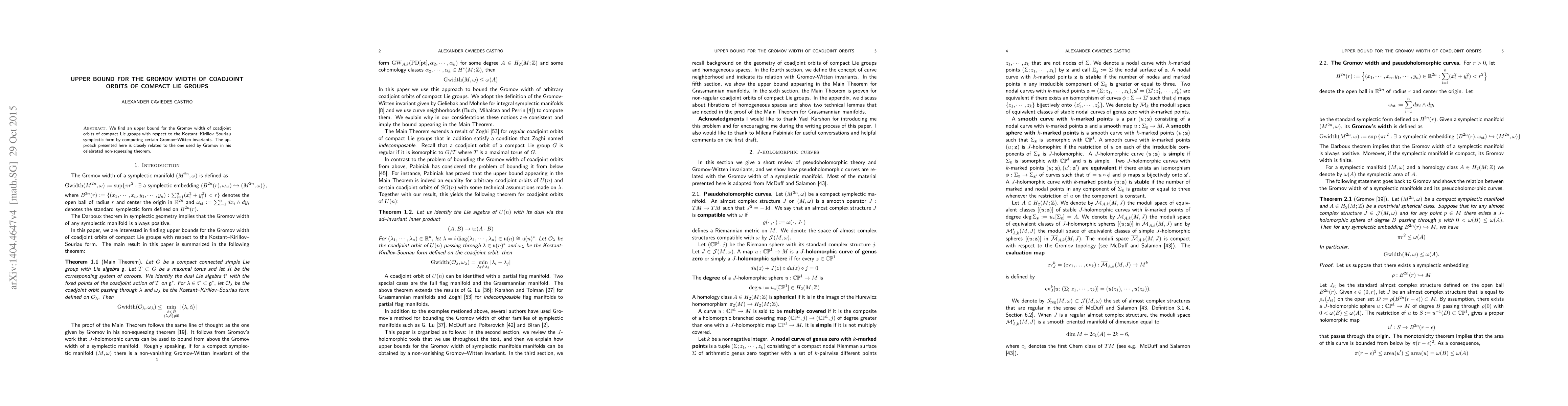 This paper establishes an upper bound for the Gromov width of coadjoint orbits of compact Lie groups using Gromov Witten invariants, drawing on techniques similar to those employed by Gromov in his nonsqueezing theorem. The study leverages the Kirillov Kostant Souriau form to achieve this result.