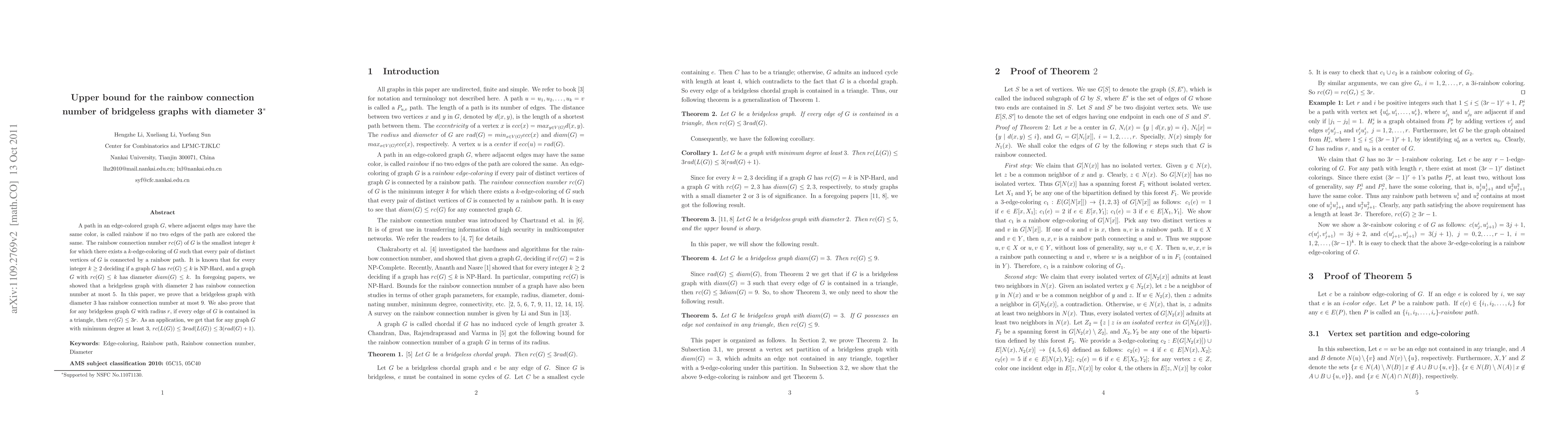 A new upper bound of 9 is set for the rainbow connection number in bridgeless graphs with diameter 3, improving upon previous results.
