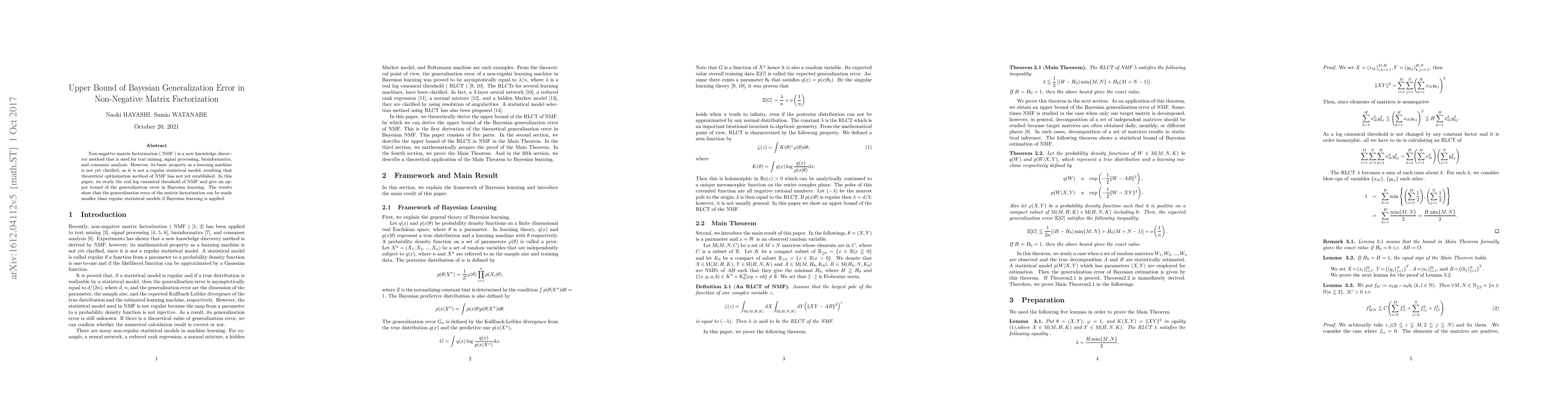 Non-negative matrix factorization (NMF) is a new knowledge discovery method that is used for text mining, signal processing, bioinformatics, and consumer analysis. However, its basic property as a learning machine is not yet clarified, as it is not a regular statistical model, resulting that theoretical optimization method of NMF has not yet established. In this paper, we study the real log canonical threshold of NMF and give an upper bound of the generalization error in Bayesian learning. The results show that the generalization error of the matrix factorization can be made smaller than regular statistical models if Bayesian learning is applied.