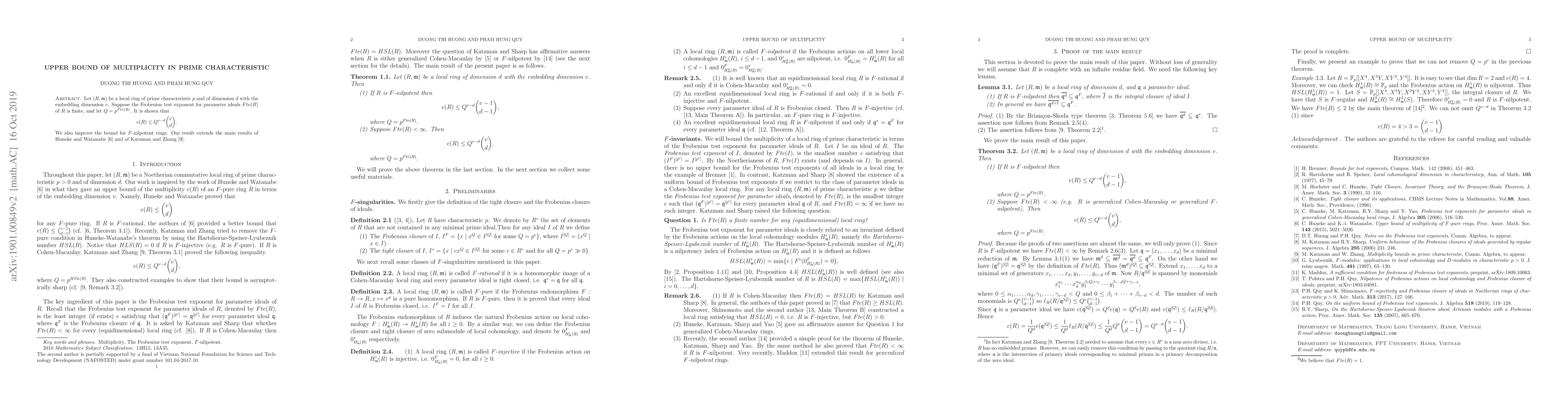 Summary: This paper establishes an upper bound for the multiplicity in local rings of prime characteristic, showing that $e(R) \le Q^{v-d} \binom{v}{d}$ for certain parameter ideals, where $Q = p^{Fte(R)}$, improving previous results for $F$-nilpotent rings.
