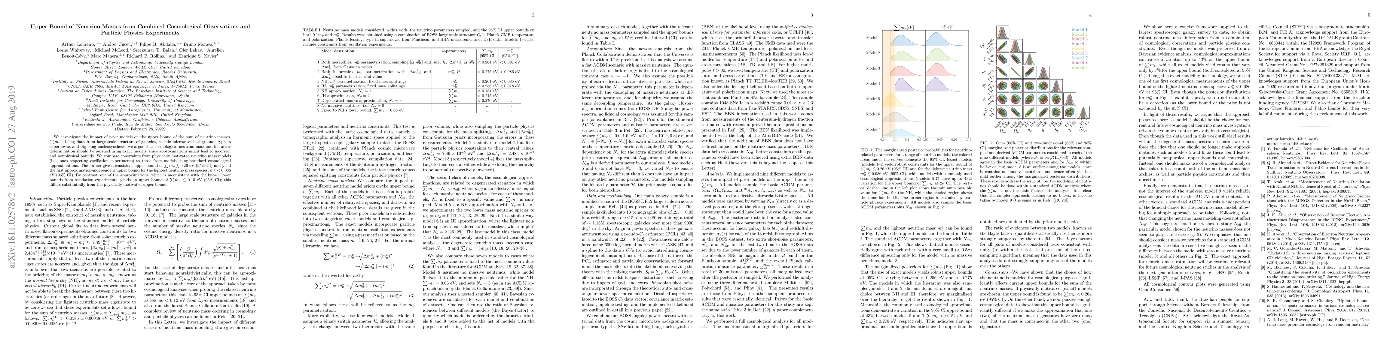 This paper investigates the upper bound of the sum of neutrino masses using combined cosmological and particle physics data, finding an upper bound of $\sum m_{\nu} \lesssim 0.26$ eV ($95\%$ CI) with physically motivated models, contrasting with a less consistent approximation yielding $\sum m_{\nu} \lesssim 0.15$ eV ($95\%$ CI). It advocates for the use of physically motivated models to avoid incorrect upper bounds.