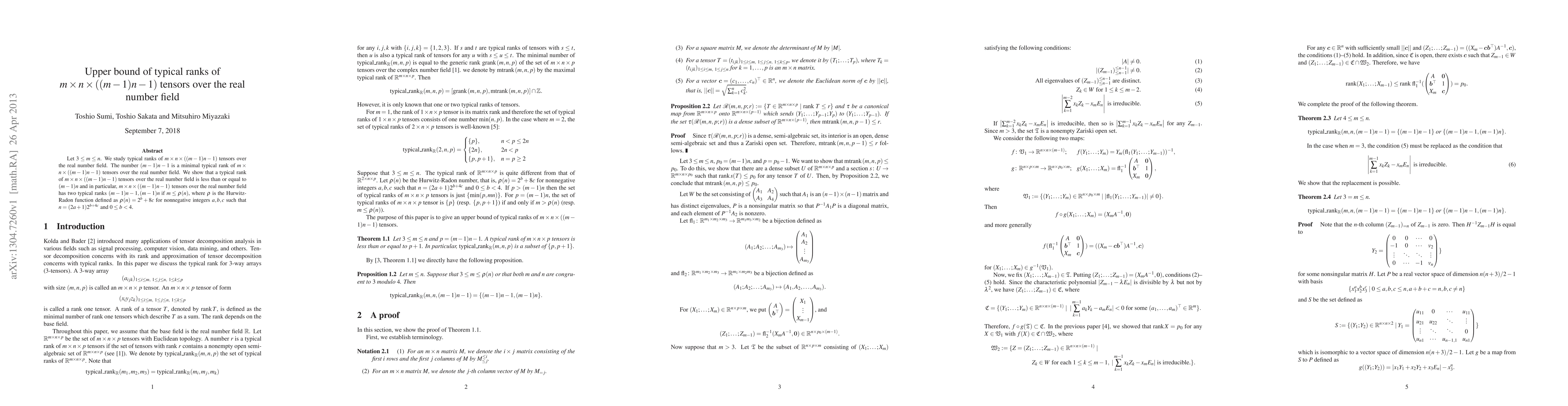 Let $3\leq m\leq n$. We study typical ranks of $m\times n\times ((m-1)n-1)$ tensors over the real number field. The number $(m-1)n-1$ is a minimal typical rank of $m\times n\times ((m-1)n-1)$ tensors over the real number field. We show that a typical rank of $m\times n\times ((m-1)n-1)$ tensors over the real number field is less than or equal to $(m-1)n$ and in particular, $m\times n\times ((m-1)n-1)$ tensors over the real number field has two typical ranks $(m-1)n-1, (m-1)n$ if $m\leq \rho(n)$, where $\rho$ is the Hurwitz-Radon function defined as $\rho(n)=2^b+8c$ for nonnegative integers $a,b,c$ such that $n=(2a+1)2^{b+4c}$ and $0\leq b<4$.
