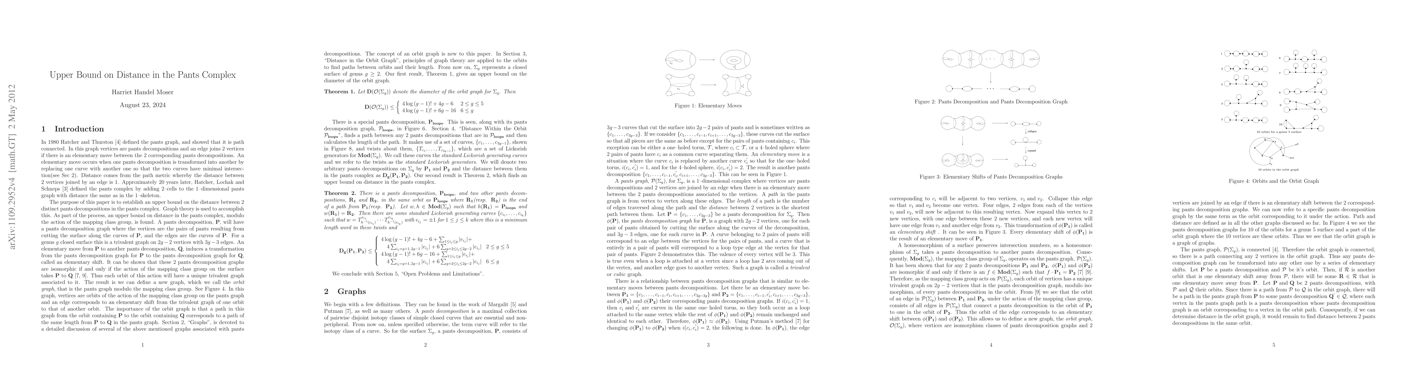 The purpose of this paper is to establish an upper bound on the distance between two pants decompositions in the pants complex for a closed surface of genus g >= 2. This is done by use of graph theory. First distance is found in the pants graph modulo the action of the mapping class group, and then between pants decompositions within an orbit of this action.