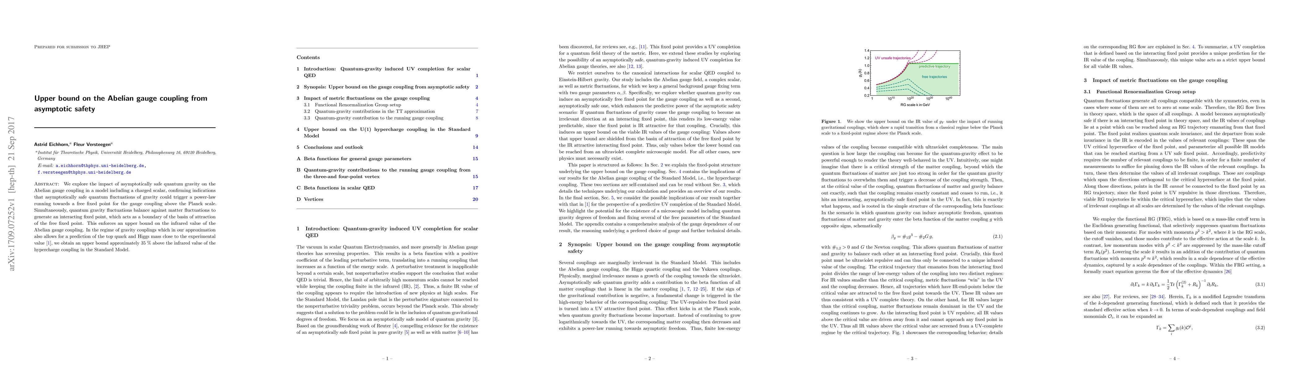 We explore the impact of asymptotically safe quantum gravity on the Abelian gauge coupling in a model including a charged scalar, confirming indications that asymptotically safe quantum fluctuations of gravity could trigger a power-law running towards a free fixed point for the gauge coupling above the Planck scale. Simultaneously, quantum gravity fluctuations balance against matter fluctuations to generate an interacting fixed point, which acts as a boundary of the basin of attraction of the free fixed point. This enforces an upper bound on the infrared value of the Abelian gauge coupling. In the regime of gravity couplings which in our approximation also allows for a prediction of the top quark and Higgs mass close to the experimental value [1], we obtain an upper bound approximately 35% above the infrared value of the hypercharge coupling in the Standard Model.