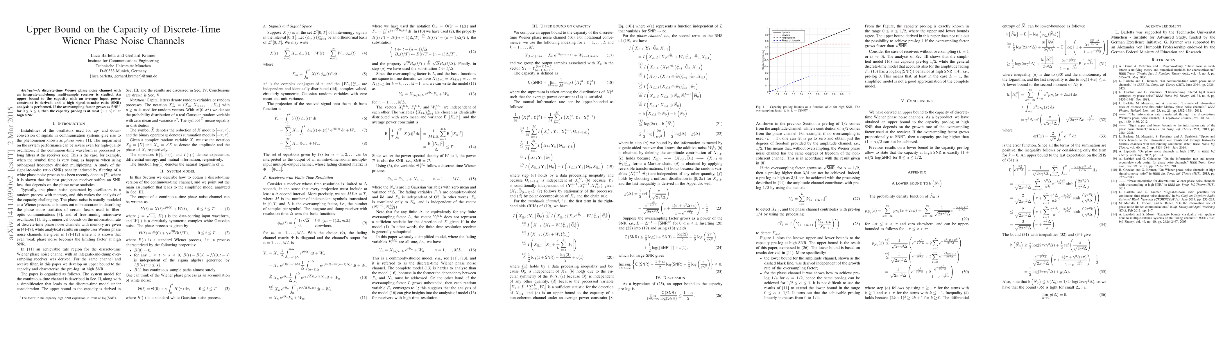 This paper derives an upper bound on the capacity of discrete-time Wiener phase noise channels with an integrate-and-dump multi-sample receiver, showing that the capacity pre-log is at most $(1+\alpha)/2$ at high SNR when the oversampling factor scales as $\text{SNR}^\alpha$ for $0\le \alpha \le 1$.