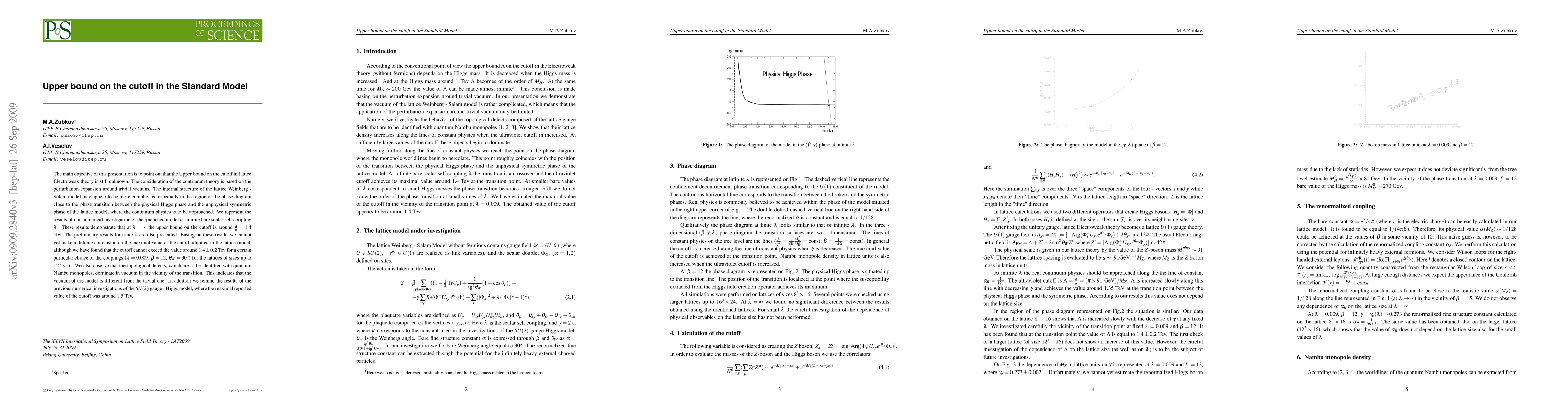 The main objective of this presentation is to point out that the Upper bound on the cutoff in lattice Electroweak theory is still unknown. The consideration of the continuum theory is based on the perturbation expansion around trivial vacuum. The internal structure of the lattice Weinberg - Salam model may appear to be more complicated especially in the region of the phase diagram close to the phase transition between the physical Higgs phase and the unphysical symmetric phase of the lattice model, where the continuum physics is to be approached. We represent the results of our numerical investigation of the quenched model at infinite bare scalar self coupling $\lambda$. These results demonstrate that at $\lambda = \infty$ the upper bound on the cutoff is around $\frac{\pi}{a} = 1.4$ Tev. The preliminary results for finite $\lambda$ are also presented. Basing on these results we cannot yet make a definite conclusion on the maximal value of the cutoff admitted in the lattice model, although we have found that the cutoff cannot exceed the value around $1.4 \pm 0.2$ Tev for a certain particular choice of the couplings ($\lambda = 0.009$, $\beta = 12$, $\theta_W = 30^o$) for the lattices of sizes up to $12^3\times16$. We also observe that the topological defects, which are to be identified with quantum Nambu monopoles, dominate in vacuum in the vicinity of the transition. This indicates that the vacuum of the model is different from the trivial one. In addition we remind the results of the previous numerical investigations of the SU(2) gauge - Higgs model, where the maximal reported value of the cutoff was around 1.5 Tev.