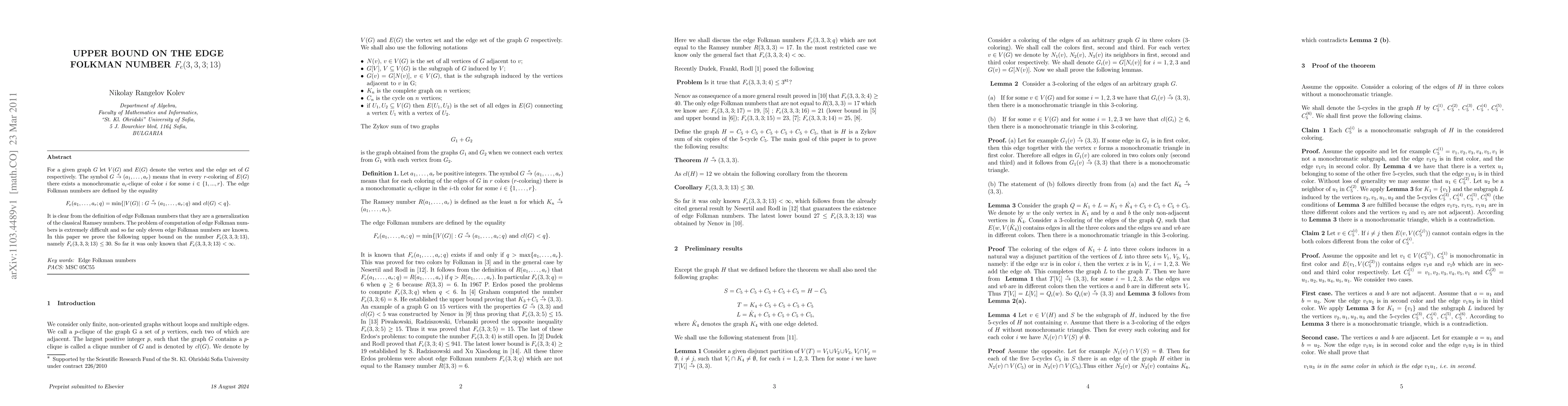 This paper investigates edge Folkman numbers within Ramsey theory, providing an upper bound for the specific constant $F_e(3,3,3;13)$. The results contribute to the understanding of combinatorial structures in graph theory.