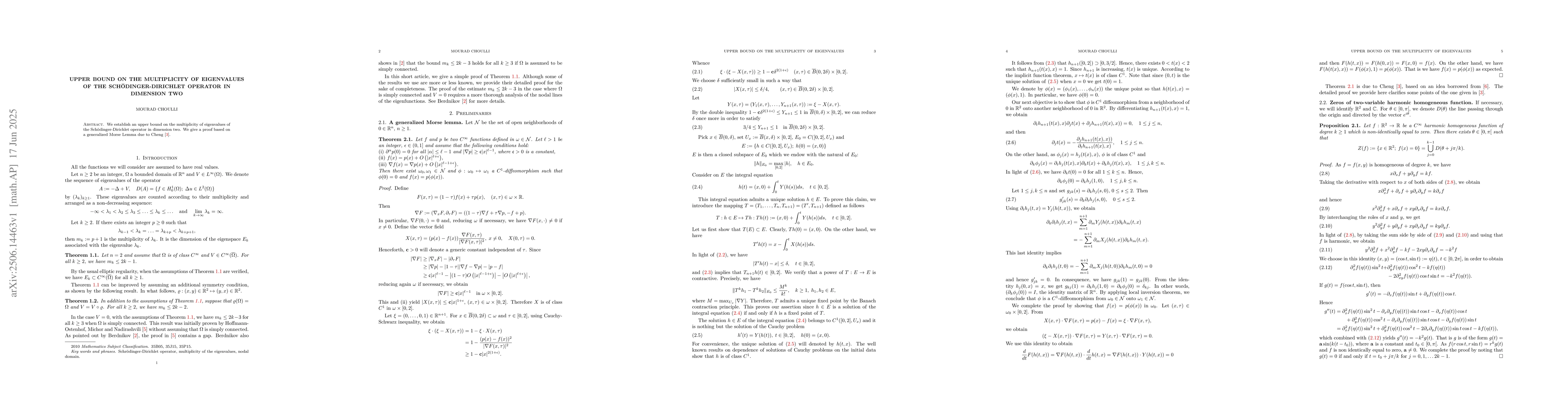 We establish an upper bound on the multiplicity of eigenvalues of the Sch\"odinger-Dirichlet operator in dimension two. We give a proof based on a generalized Morse Lemma due to Cheng \cite{Ch}.