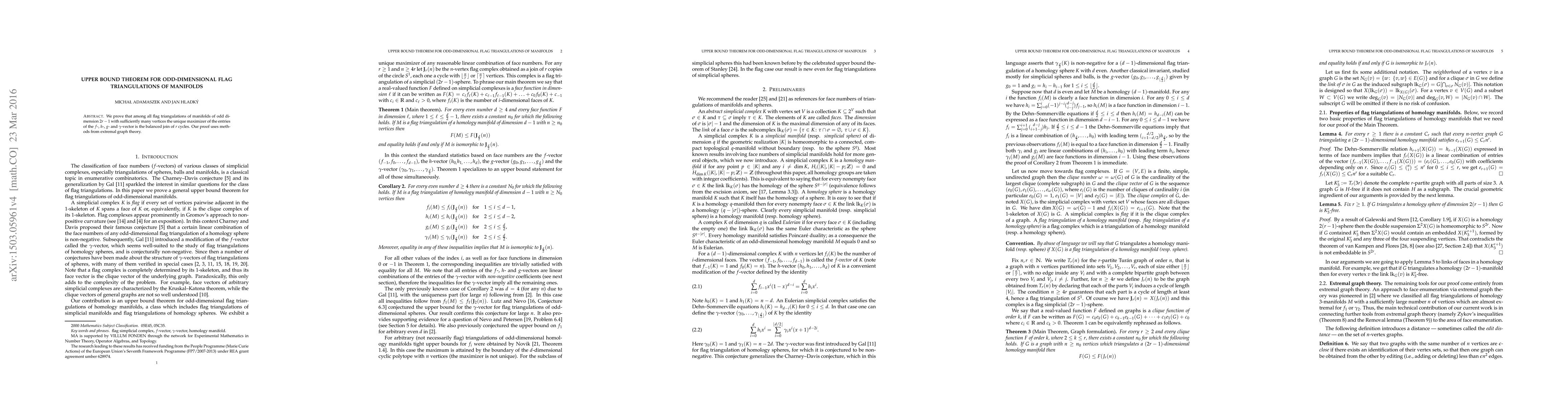 This paper proves an upper bound theorem for odd-dimensional flag triangulations, showing that the balanced join of r cycles maximizes the entries of the f-, h-, g-, and gamma-vectors among all such triangulations. The proof employs techniques from extremal graph theory.