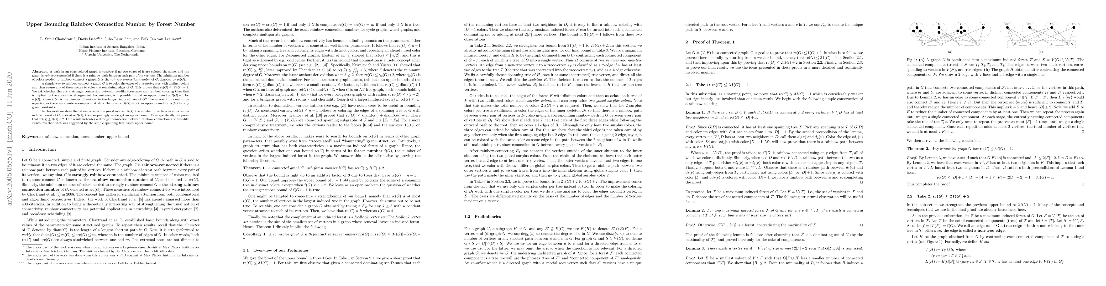 A path in an edge-colored graph is rainbow if no two edges of it are colored the same, and the graph is rainbow-connected if there is a rainbow path between each pair of its vertices. The minimum number of colors needed to rainbow-connect a graph $G$ is the rainbow connection number of $G$, denoted by $\text{rc}(G)$. A simple way to rainbow-connect a graph $G$ is to color the edges of a spanning tree with distinct colors and then re-use any of these colors to color the remaining edges of $G$. This proves that $\text{rc}(G) \le |V(G)|-1$. We ask whether there is a stronger connection between tree-like structures and rainbow coloring than that is implied by the above trivial argument. For instance, is it possible to find an upper bound of $t(G) -1$ for $\text{rc}(G)$, where $t(G)$ is the number of vertices in the largest induced tree of $G$? The answer turns out to be negative, as there are counter-examples that show that even $c\cdot t(G)$ is not an upper bound for $\text{rc}(G))$ for any given constant $c$. In this work we show that if we consider the forest number $f(G)$, the number of vertices in a maximum induced forest of $G$, instead of $t(G)$, then surprisingly we do get an upper bound. More specifically, we prove that $\text{rc}(G) \leq f(G) + 2$. Our result indicates a stronger connection between rainbow connection and tree-like structures than that was suggested by the simple spanning tree based upper bound.