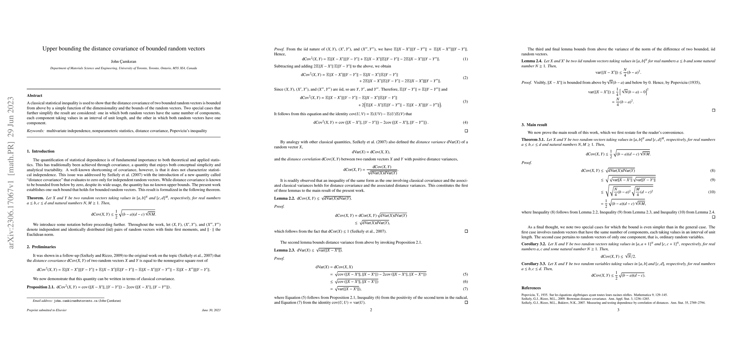 This paper establishes an upper bound for the distance covariance of bounded random vectors using a classical statistical inequality, and simplifies the result for cases where the vectors have identical component lengths or single components.