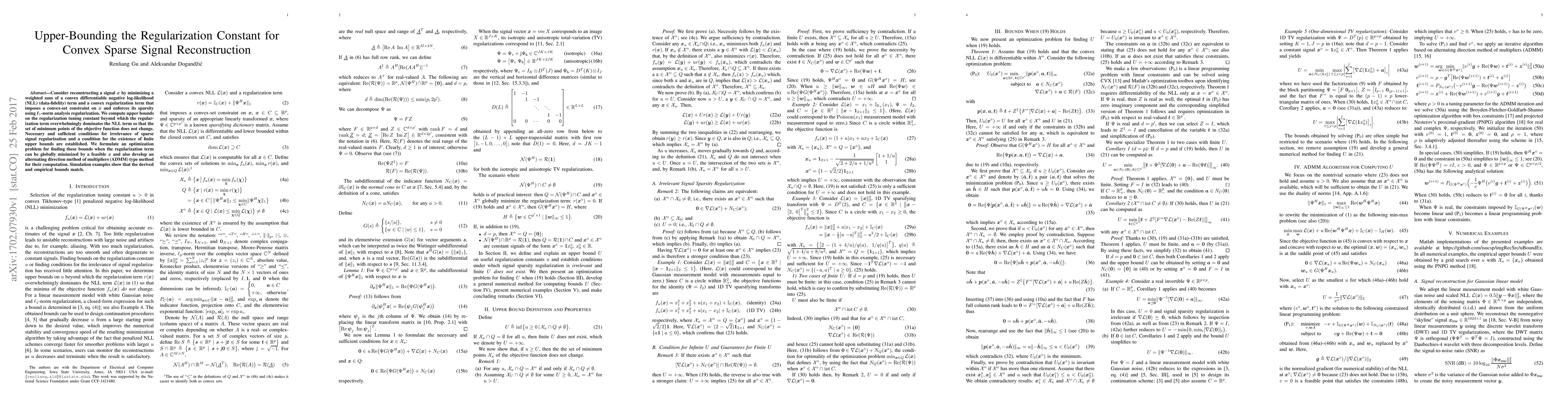 This paper establishes upper bounds on the regularization constant for convex sparse signal reconstruction, ensuring that the regularization term does not dominate the data-fidelity term. It formulates an optimization problem and an ADMM method for computing these bounds, validated through simulation examples.
