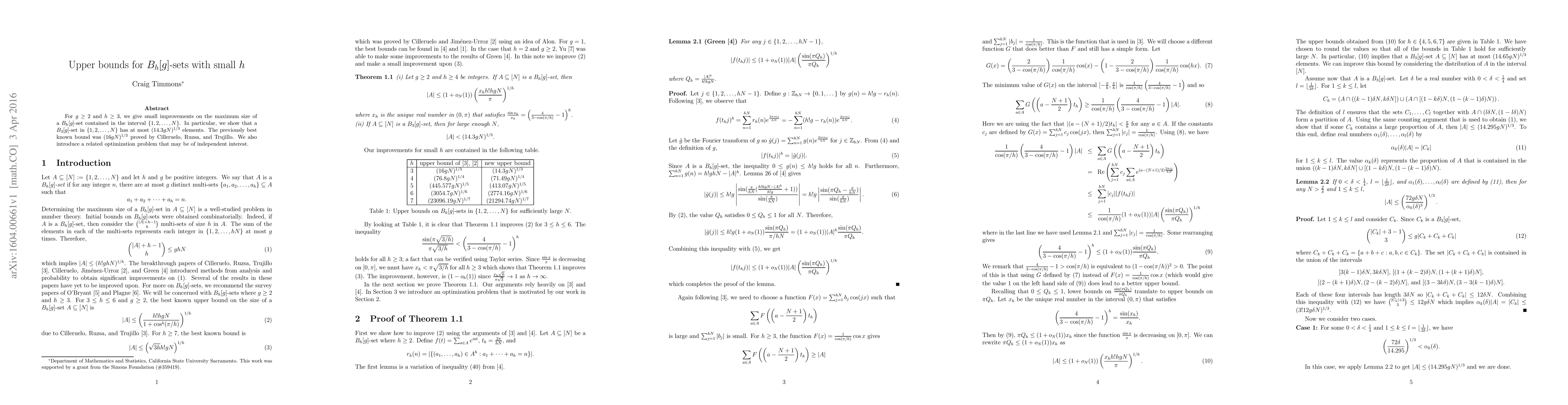 Researchers found a new upper bound for the maximum size of B_h[g]-sets within an interval, improving upon previous bounds for specific h values.