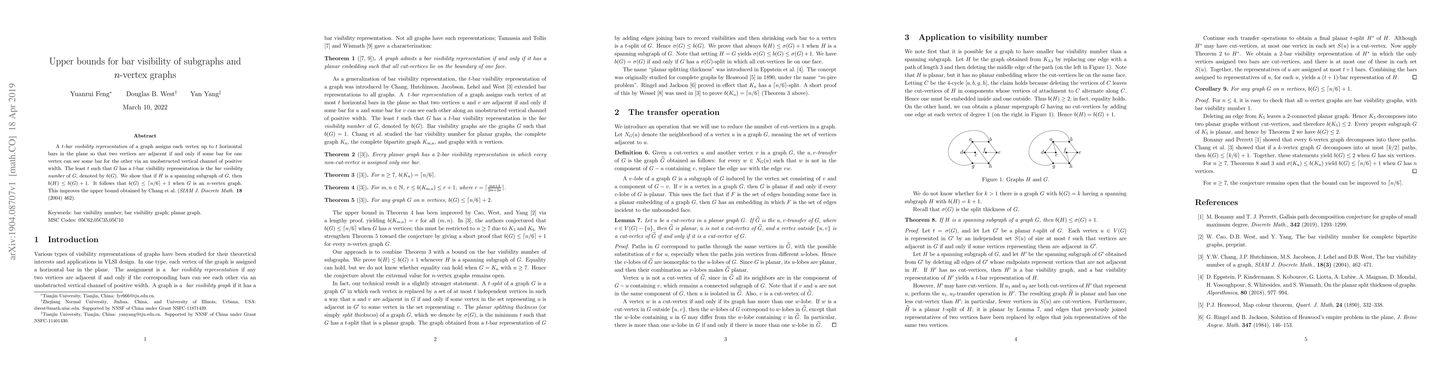 A $t$-bar visibility representation of a graph assigns each vertex up to $t$ horizontal bars in the plane so that two vertices are adjacent if and only if some bar for one vertex can see some bar for the other via an unobstructed vertical channel of positive width. The least $t$ such that $G$ has a $t$-bar visibility representation is the bar visibility number of $G$, denoted by $b(G)$. We show that if $H$ is a spanning subgraph of $G$, then $b(H)\le b(G)+1$. It follows that $b(G)\le \lceil n/6\rceil+1$ when $G$ is an $n$-vertex graph. This improves the upper bound obtained by Chang et al. (SIAM J. Discrete Math. 18 (2004) 462).