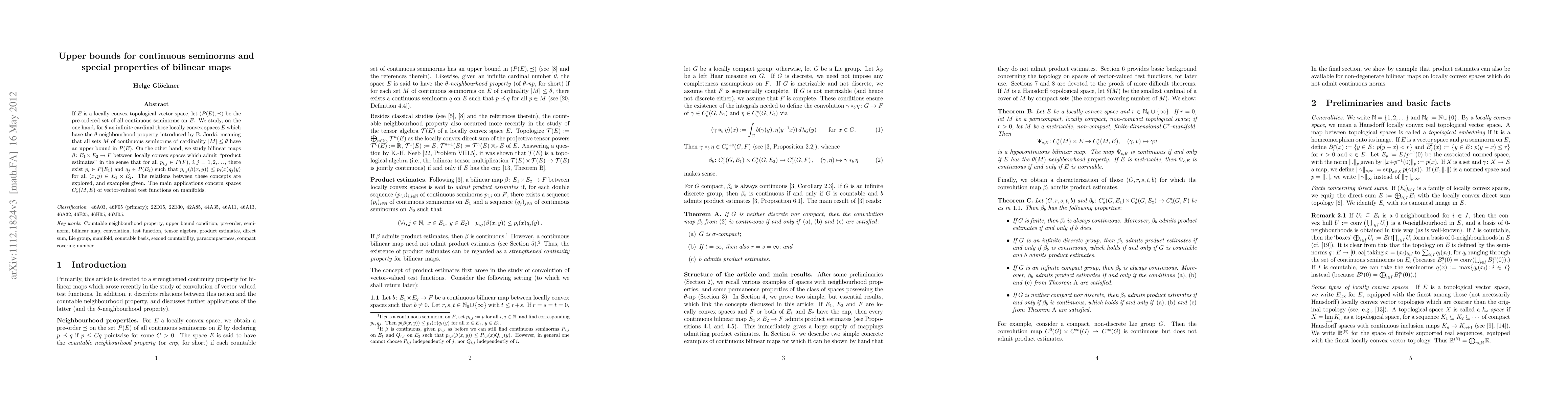 If E is a locally convex topological vector space, let P(E) be the pre-ordered set of all continuous seminorms on E. We study, on the one hand, for g an infinite cardinal those locally convex spaces E which have the g-neighbourhood property in the sense of E. Jorda, i.e., spaces in which all sets M of continuous seminorms of cardinality up to g have an upper bound in P(E). On the other hand, we study bilinear maps b from a product of locally convex spaces E_1 and E_2 to a locally convex space F, which admit "product estimates" in the sense that for all p_{i,j} in P(F), i,j=1,2,..., there exist p_i in P(E_1) and q_j in P(E_2) such that p_{i,j}(b(x,y)) <= p_i(x)q_j(y) for all x in E_1, y in E_2. The relations between these concepts are explored, and examples given. The main applications concern spaces C^r_c(M,E)$ of vector-valued test functions on manifolds.