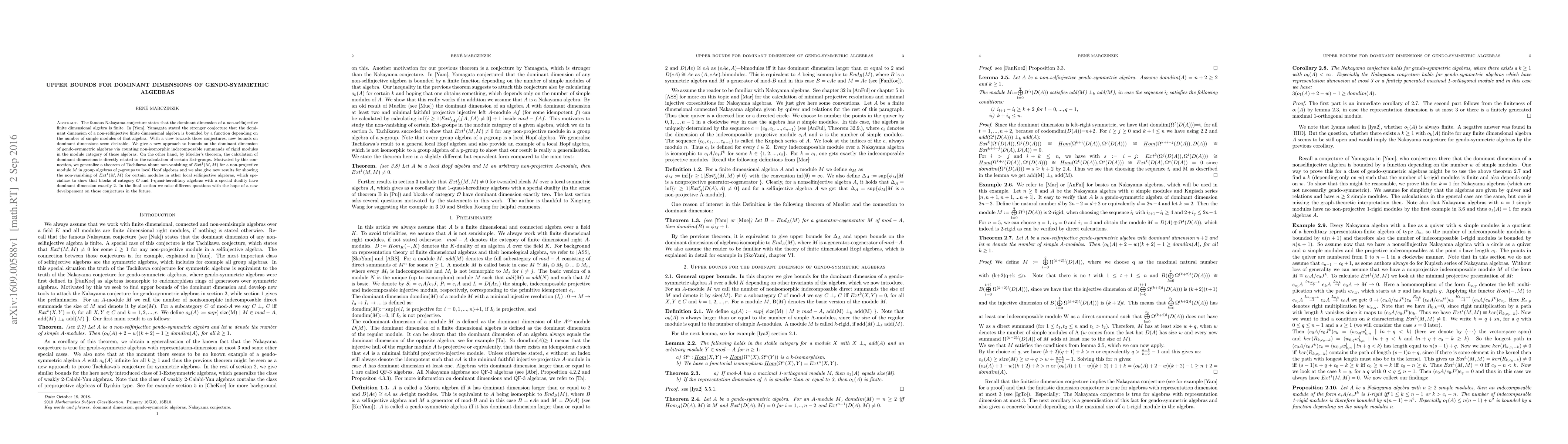 The paper presents new bounds on the dominant dimensions of gendo-symmetric algebras by counting non-isomorphic indecomposable summands of rigid modules. It also generalizes Tachikawa's theorem about non-vanishing $Ext^{1}(M,M)$ to local Hopf algebras and shows similar results for other local selfinjective algebras, particularly establishing dominant dimension exactly 2 for specific blocks and algebras.