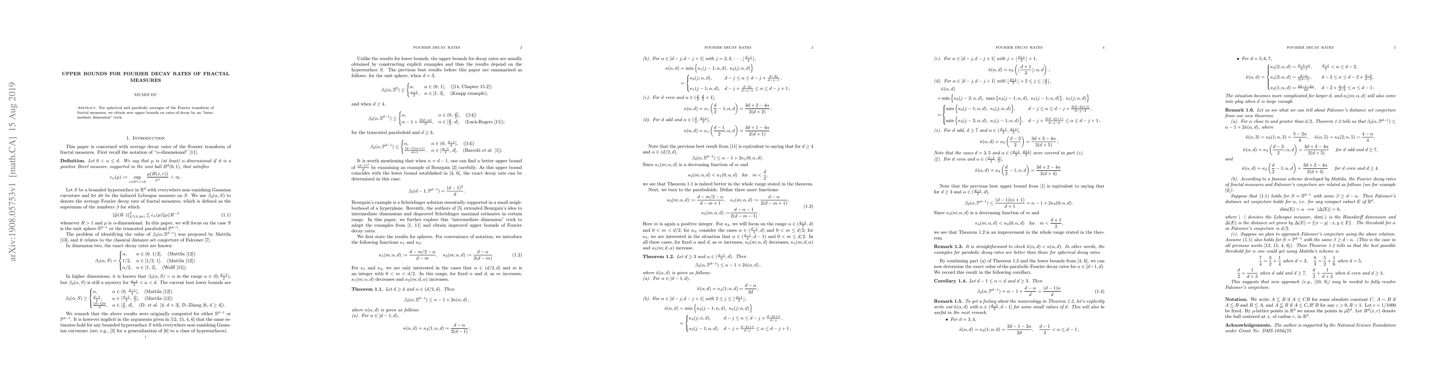 Summary: This paper establishes new upper bounds for the decay rates of Fourier transforms of fractal measures through spherical and parabolic averages, utilizing an "intermediate dimension" approach. The findings provide insights into the behavior of fractal measures in the frequency domain.