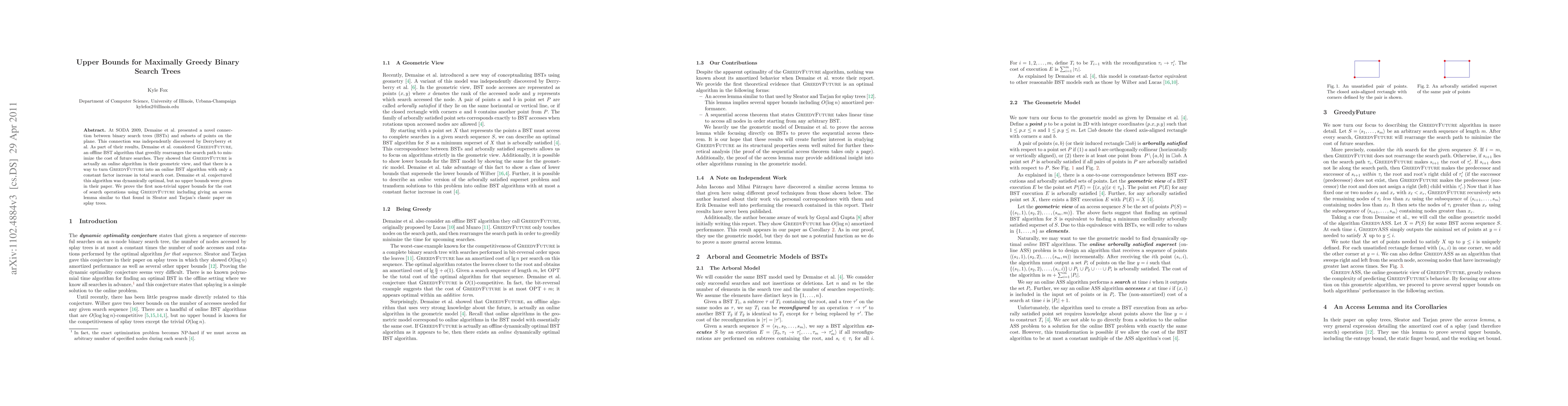 At SODA 2009, Demaine et al. presented a novel connection between binary search trees (BSTs) and subsets of points on the plane. This connection was independently discovered by Derryberry et al. As part of their results, Demaine et al. considered GreedyFuture, an offline BST algorithm that greedily rearranges the search path to minimize the cost of future searches. They showed that GreedyFuture is actually an online algorithm in their geometric view, and that there is a way to turn GreedyFuture into an online BST algorithm with only a constant factor increase in total search cost. Demaine et al. conjectured this algorithm was dynamically optimal, but no upper bounds were given in their paper. We prove the first non-trivial upper bounds for the cost of search operations using GreedyFuture including giving an access lemma similar to that found in Sleator and Tarjan's classic paper on splay trees.