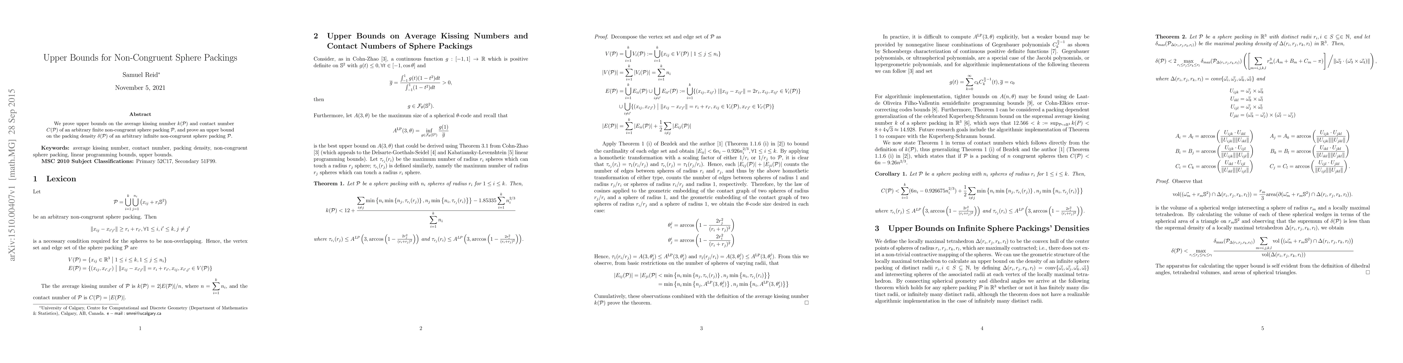 We prove upper bounds on the average kissing number $k(\mathcal{P})$ and contact number $C(\mathcal{P})$ of an arbitrary finite non-congruent sphere packing $\mathcal{P}$, and prove an upper bound on the packing density $\delta(\mathcal{P})$ of an arbitrary infinite non-congruent sphere packing $\mathcal{P}$.