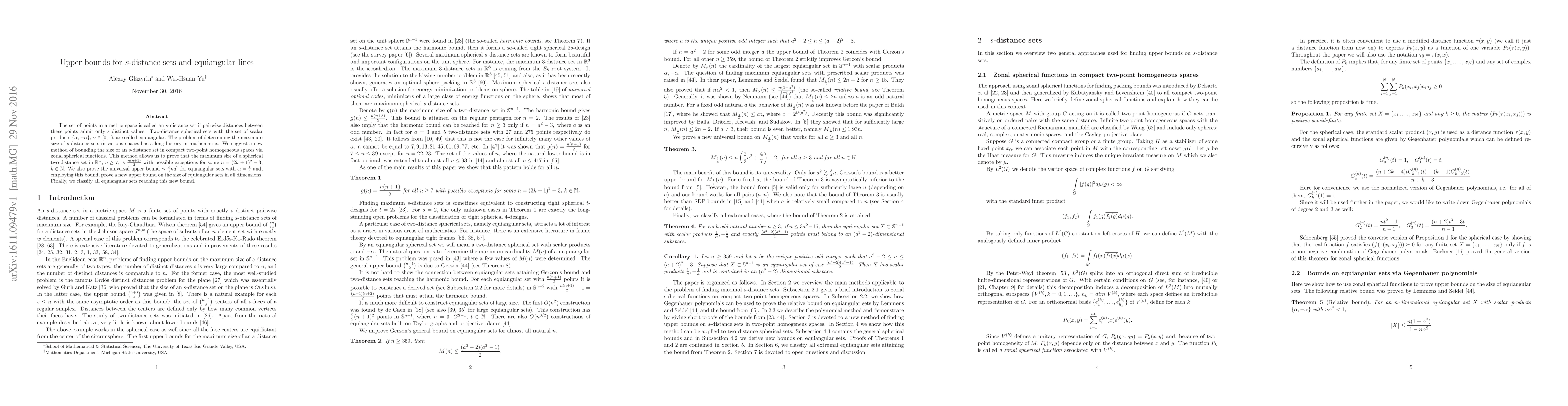 The set of points in a metric space is called an $s$-distance set if pairwise distances between these points admit only $s$ distinct values. Two-distance spherical sets with the set of scalar products $\{\alpha, -\alpha\}$, $\alpha\in[0,1)$, are called equiangular. The problem of determining the maximum size of $s$-distance sets in various spaces has a long history in mathematics. We suggest a new method of bounding the size of an $s$-distance set in compact two-point homogeneous spaces via zonal spherical functions. This method allows us to prove that the maximum size of a spherical two-distance set in $\mathbb{R}^n$, $n\geq 7$, is $\frac{n(n+1)}2$ with possible exceptions for some $n=(2k+1)^2-3$, $k \in \mathbb{N}$. We also prove the universal upper bound $\sim \frac 2 3 n a^2$ for equiangular sets with $\alpha=\frac 1 a$ and, employing this bound, prove a new upper bound on the size of equiangular sets in all dimensions. Finally, we classify all equiangular sets reaching this new bound.