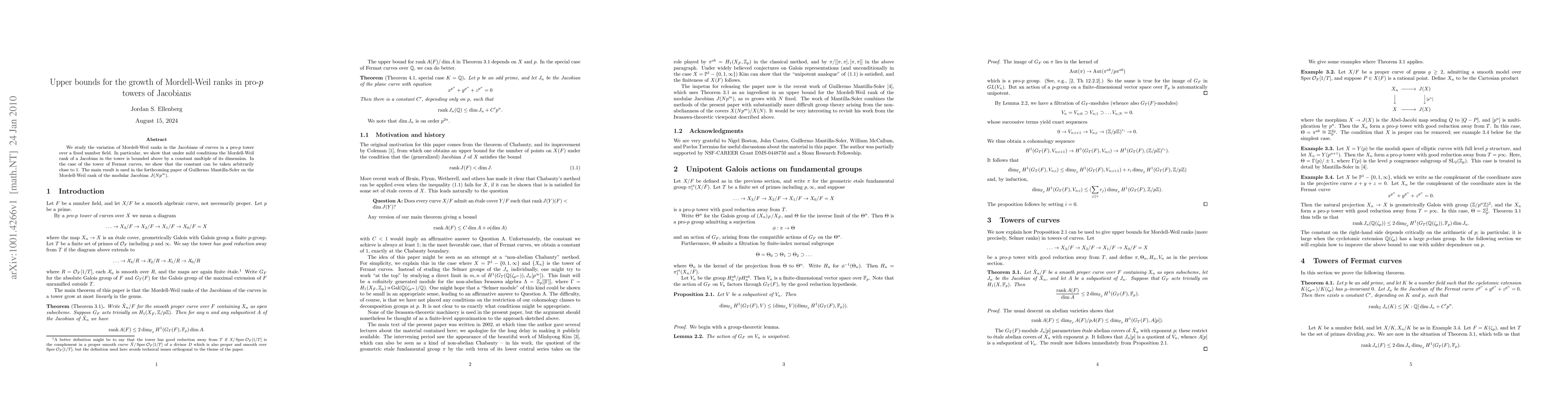This paper establishes upper bounds for the growth of Mordell-Weil ranks in Jacobians of curves within a pro-p tower over a fixed number field, showing that the rank is bounded above by a constant multiple of the Jacobian's dimension. For Fermat curves, it demonstrates that the constant can approach 1, aiding future research on the Mordell-Weil rank of modular Jacobians.