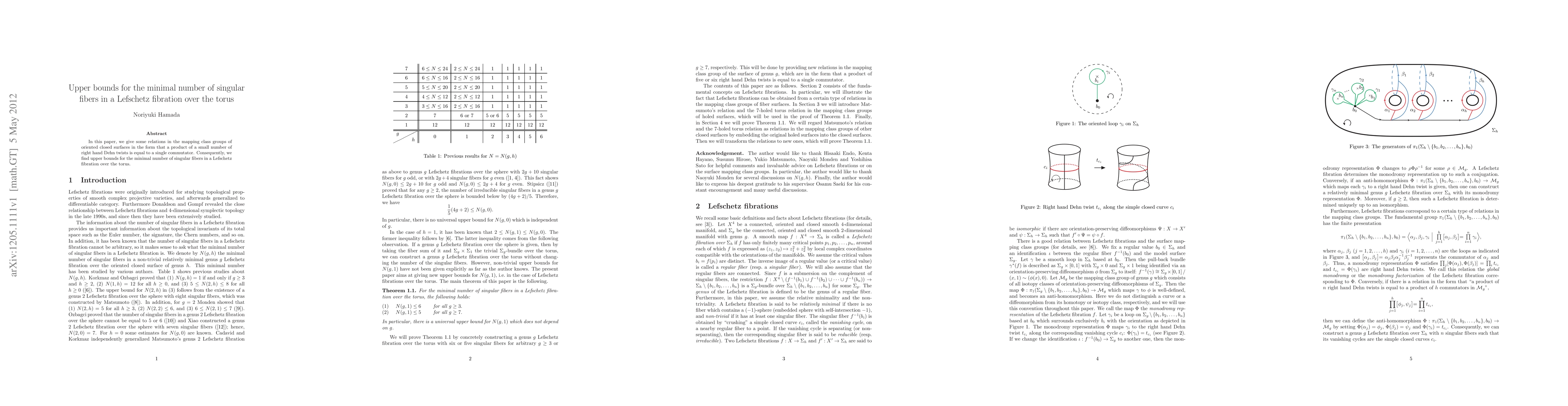 In this paper, we give some relations in the mapping class groups of oriented closed surfaces in the form that a product of a small number of right hand Dehn twists is equal to a single commutator. Consequently, we find upper bounds for the minimal number of singular fibers in a Lefschetz fibration over the torus.